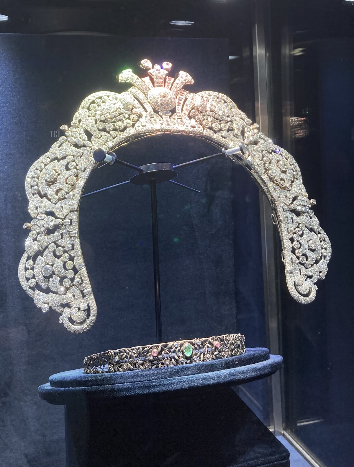 The second, smaller tiara in the display is a simpler silver bandeau-style tiara that dates to ca. 1920. Sotheby’s describes the jewel as “as an openwork bandeau of foliage and flowers, set at the centre with a cabochon emerald and with circular-cut sapphires and pink sapphire within the centres of the flowers.”