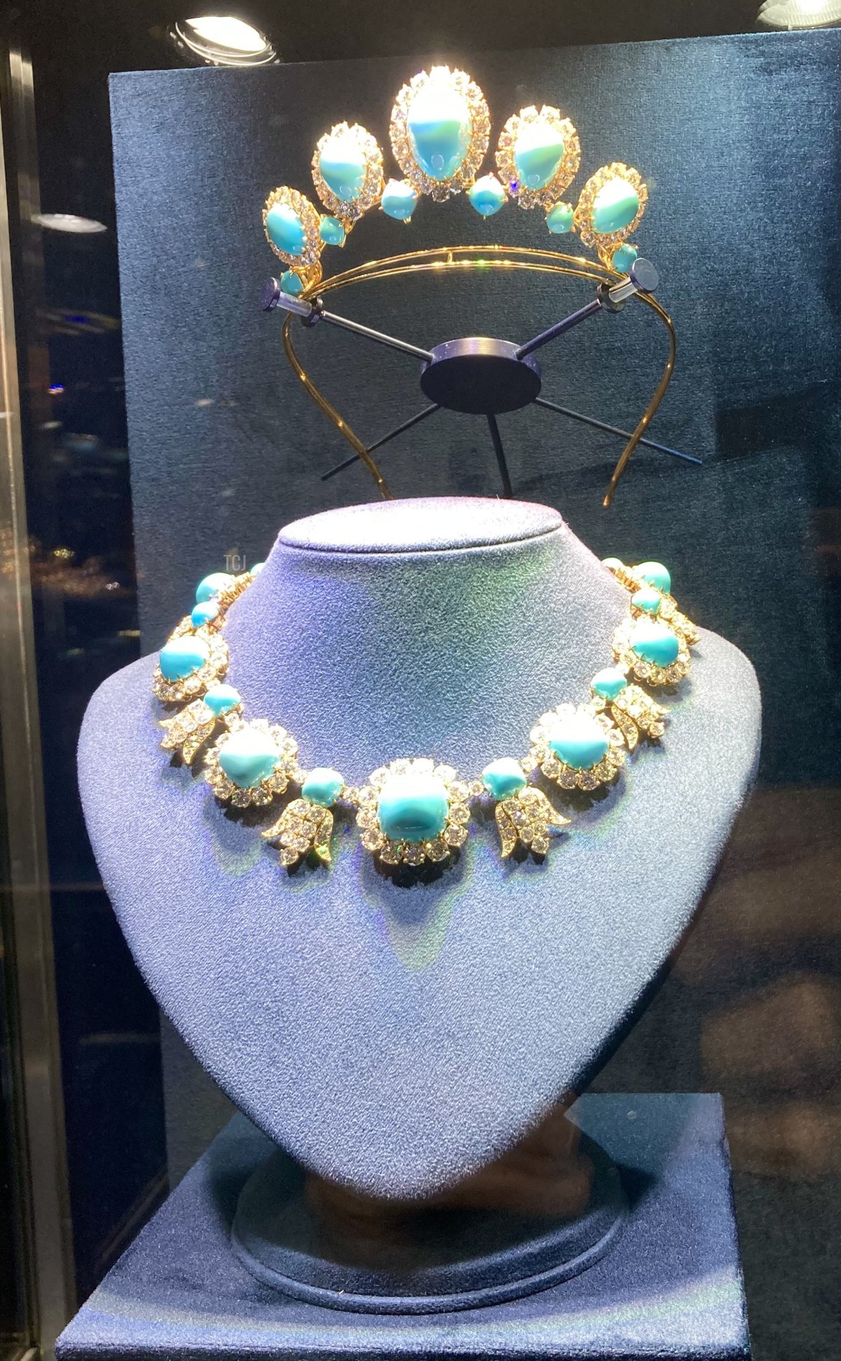 And finally, we’ve got another set of jewels that particularly intrigued Phyllis: a turquoise and diamond tiara and necklace made in the 1960s by Van Cleef & Arpels. Sotheby’s notes that turquoise jewels like this suite were inspired by designs from India. And Phyllis shares even more information with us: “Another thing I learned is that the turquoise tiara has never been worn, only the necklace has been worn and just one or two times. Gem quality turquoise is a soft stone that discolors easily from body contact, hence these turquoise pieces being rarely or never worn. The uprights on that tiara also are removable and can be attached to the necklace as pendants, I think at the ‘flower base’ motifs.”