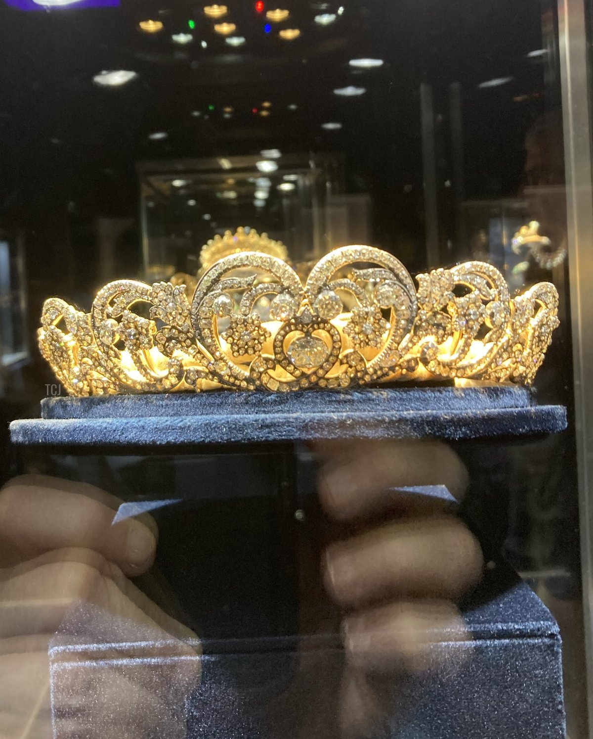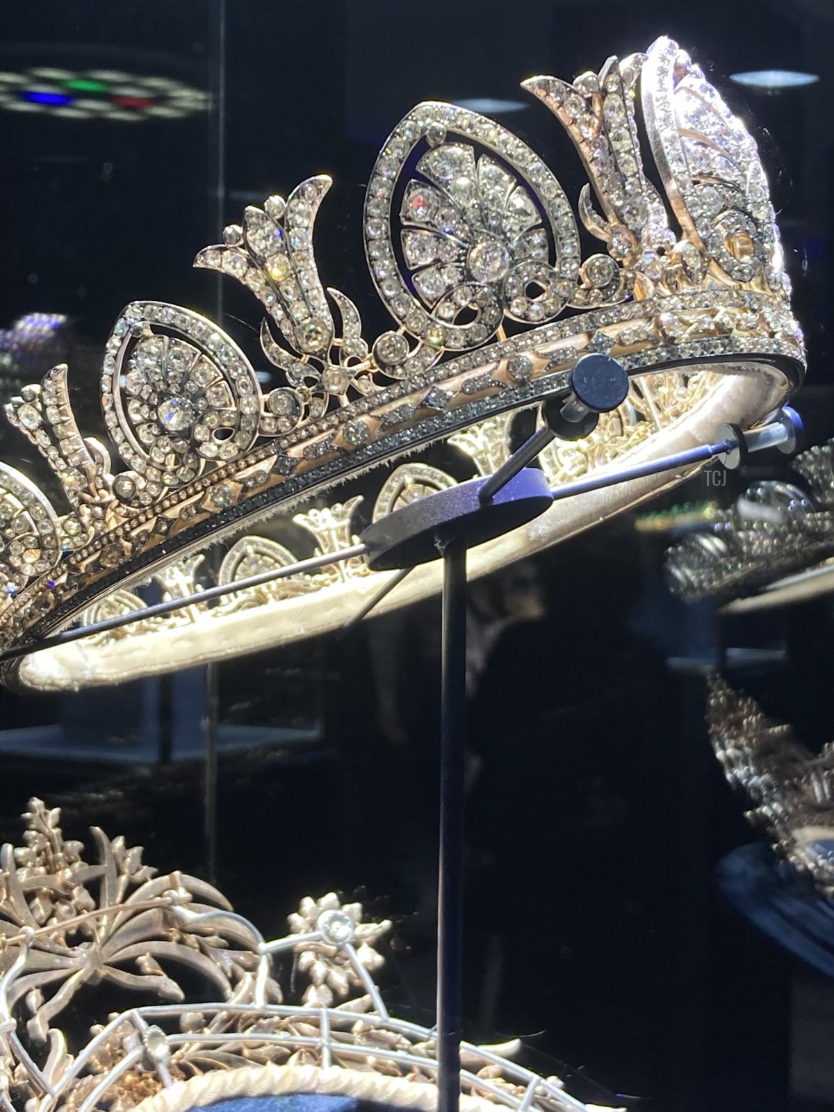 One of the most famous tiaras displayed in the exhibition was the Spencer Tiara, which we discussed at length here on the site a few days ago. It was made in 1937 for the Countess Spencer using a set of nineteenth-century ornaments, and it was most famously worn by Diana, Princess of Wales. Sotheby’s calls the tiara “one of the most famous diadems in modern history.” (It’s tough to disagree with that statement!) Phyllis shared that “it was a real thrill” to see the tiara in person, and that it was a highlight, along with another very important royal jewel, Queen Victoria’s Emerald and Diamond Tiara.