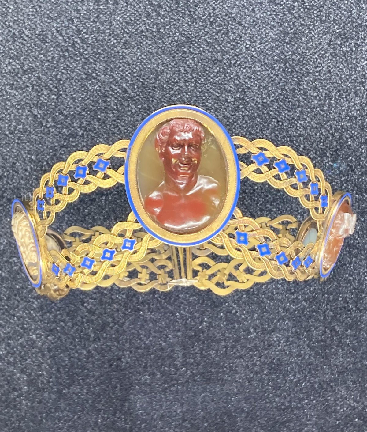 Here’s a tiara in one of the “floating” cases described by Phyllis. Sold in an auction at Sotheby’s in 2021, this golden diadem was made by Jacques-Ambroise Oliveras ca. 1805. By family tradition of the longtime owners, the Lascelles family, the tiara and its coordinating jewels belonged to Empress Joséphine of France, perhaps gifts from her sister-in-law, Caroline Bonaparte Murat. Sotheby’s has published a lengthy essay on the provenance of the tiara and its connection to Joséphine and Caroline.