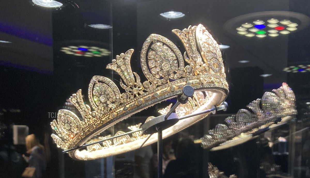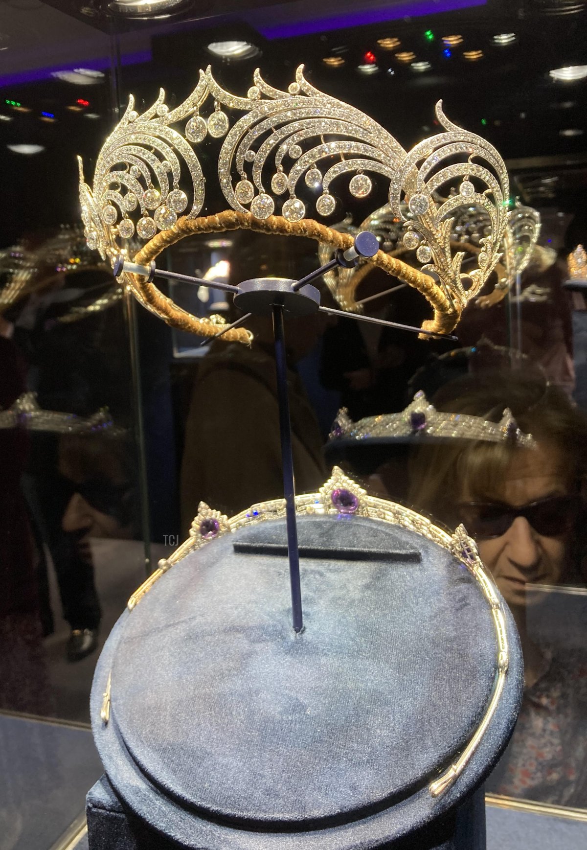 Phyllis has generously shared a selection of her photographs, plus some of her observations about the exhibition. She notes that the presentation techniques used by Sotheby’s to present some of the diadems was truly ingenious: “The tiaras are either in cases where you can walk around 360 degrees and see them from all sides or are along the walls in niche cases. The tiaras in the niche cases actually float up and down and also spin, I spoke with a Sotheby’s employee about this and evidently the wall niches, which are actually secure vaults, use a patented technology to suspend and spin the tiaras. There are no strings! I think it must use air pressure changes to do this….it’s really cool.”