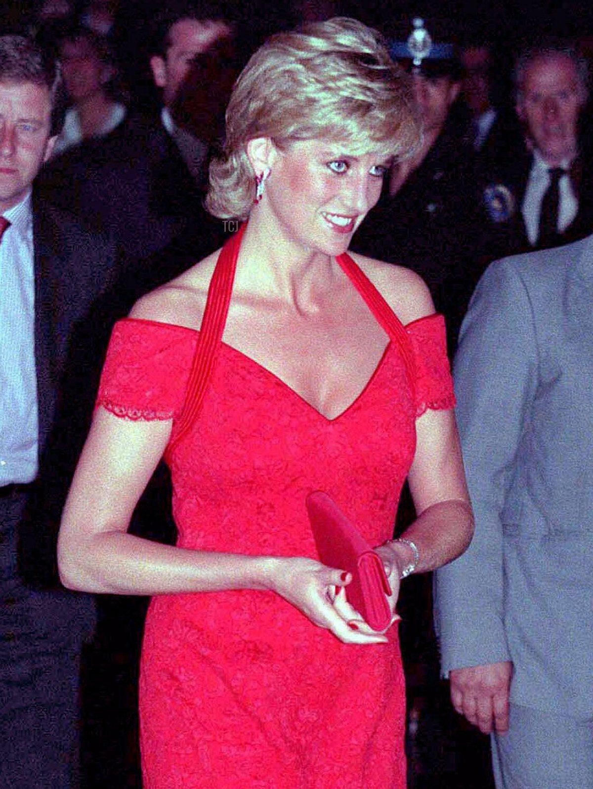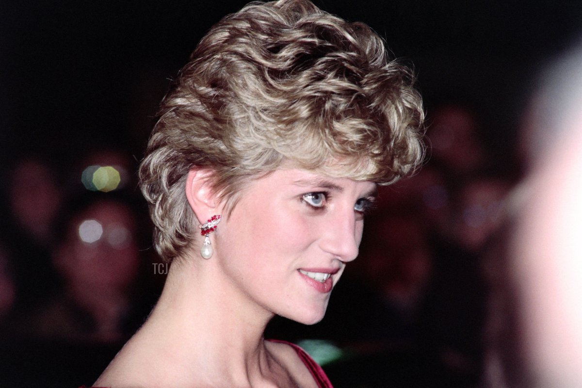 Diana wore the earrings with a single strand of pearls and a bright pink gown with a red lace overlay in December 1991 for a reception at London’s Royal School of Music. The event followed the annual “Joy to the World” Christmas spectacular at the Royal Albert Hall.