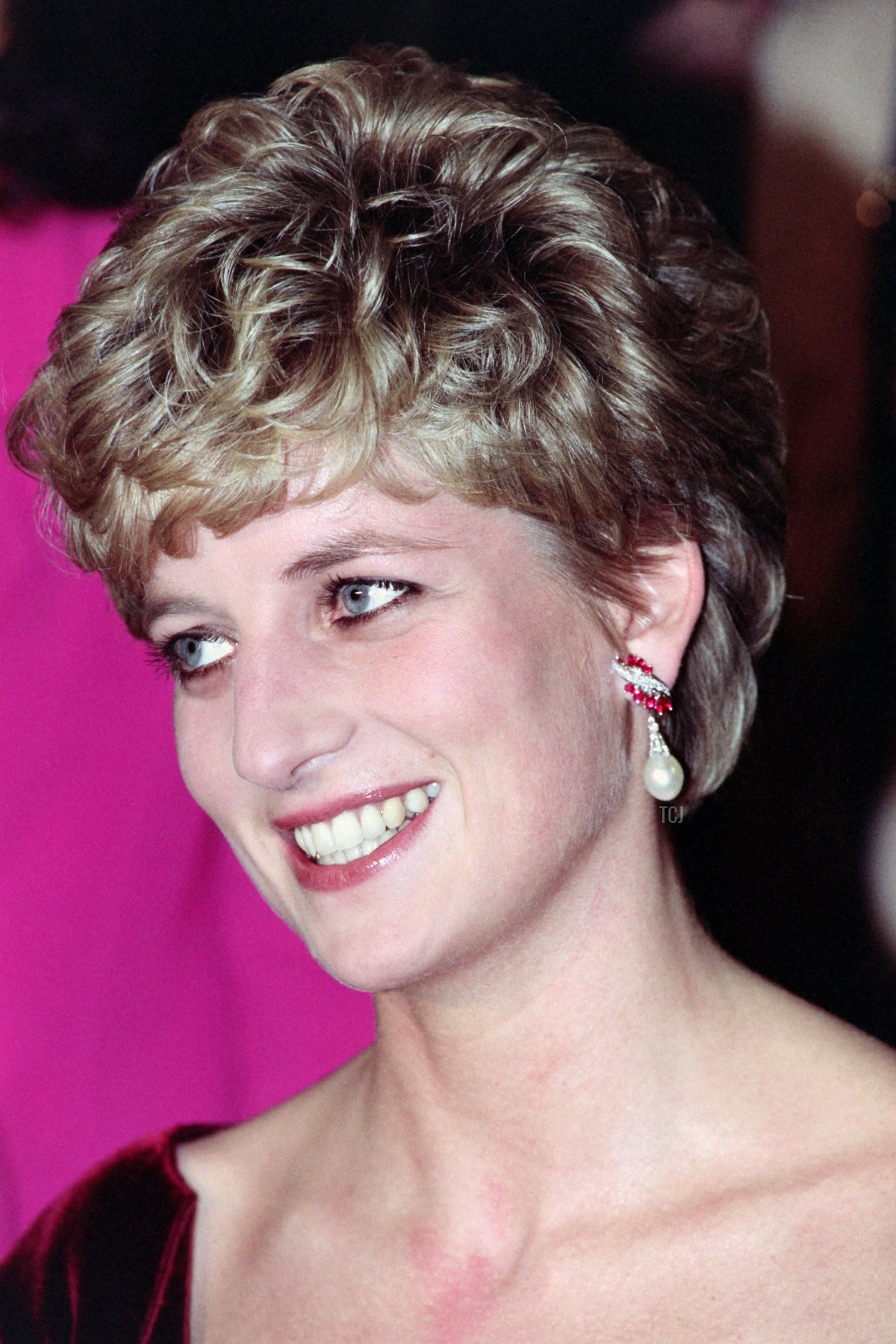 Diana almost always wore the earrings with clothing in shades of pink and red. Here, for a performance by the Welsh National Opera in Tokyo in November 1990, she wears the earrings with a classic red evening gown.