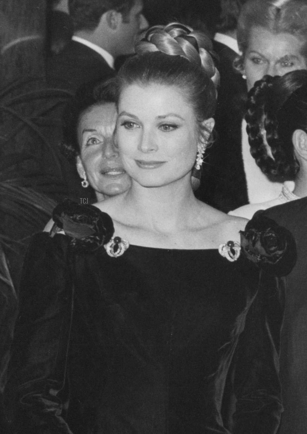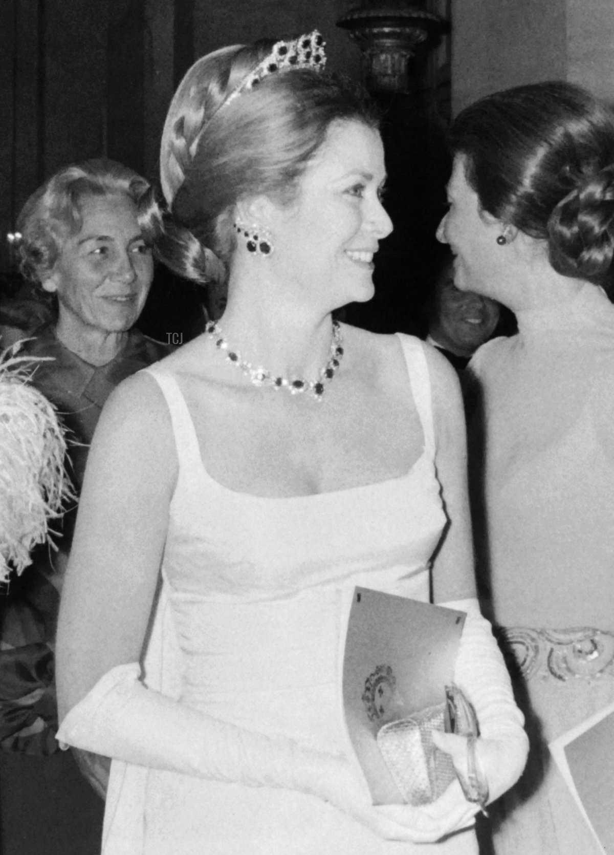 Here’s another outing for the same diamond and ruby earrings, at a gala event in Paris in 1981. Like the Bains de Mer Tiara, the ruby earrings are still with the family today—Princess Stéphanie notably wore them at the Red Cross Ball in August 2005.