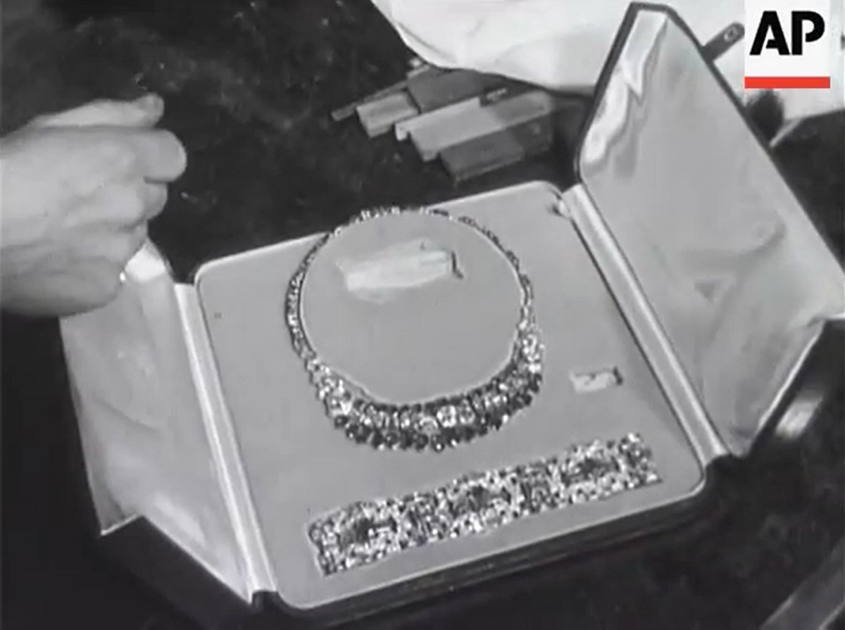 In February 1982, less than a year before her untimely death, Princess Grace made a special appearance in Night of 100 Stars, an all-star variety special taped at Radio City Music Hall in New York. The event, which was televised on ABC, celebrated the centennial of the Actors’ Fund of America. Grace appeared on stage wearing a diamond and ruby necklace and earrings with a white gown.