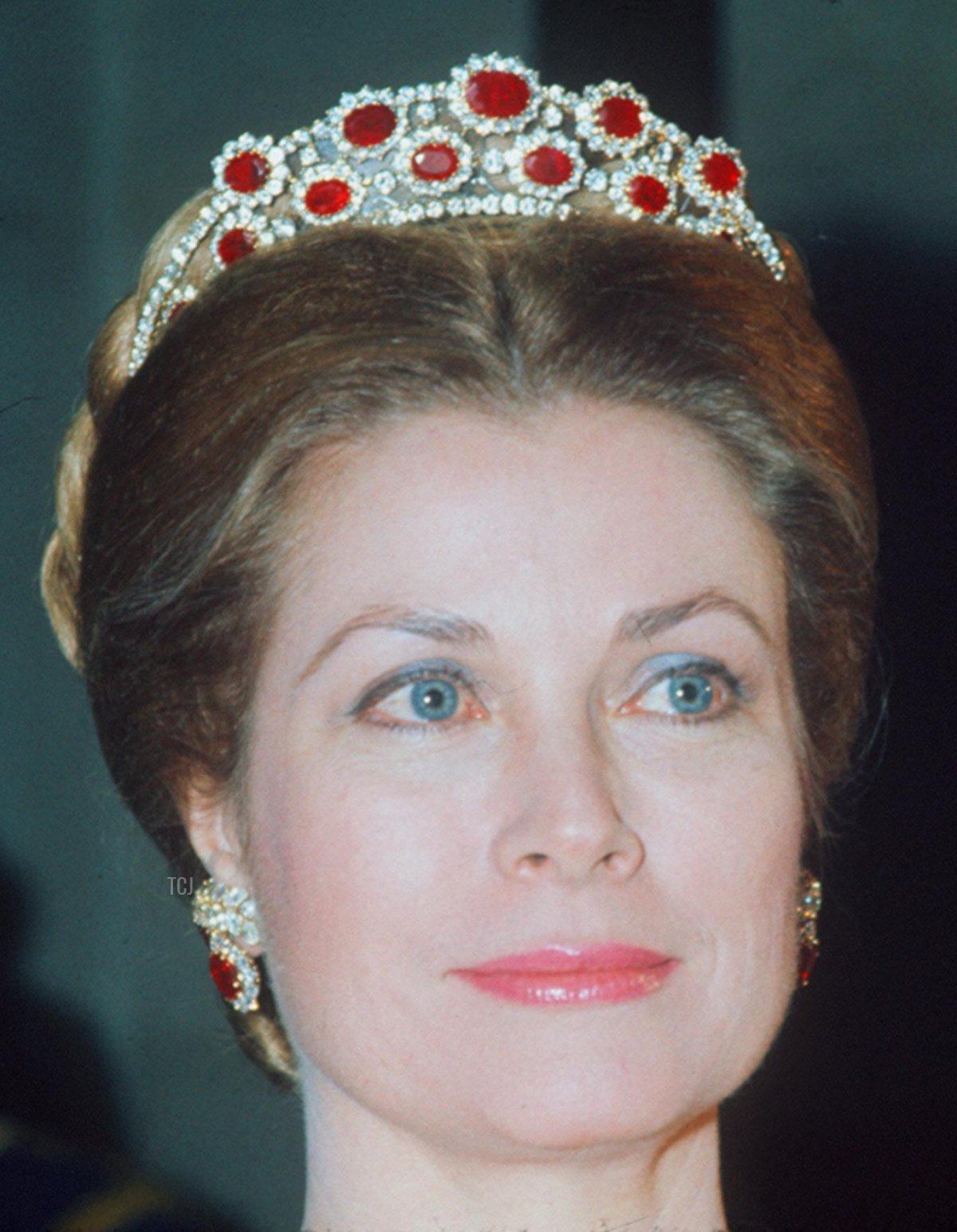This color photograph from the Versailles gala shows off the color of the rubies quite nicely. Grace wore several coordinating pieces that evening: a tiara, earrings, necklace, and bracelet.