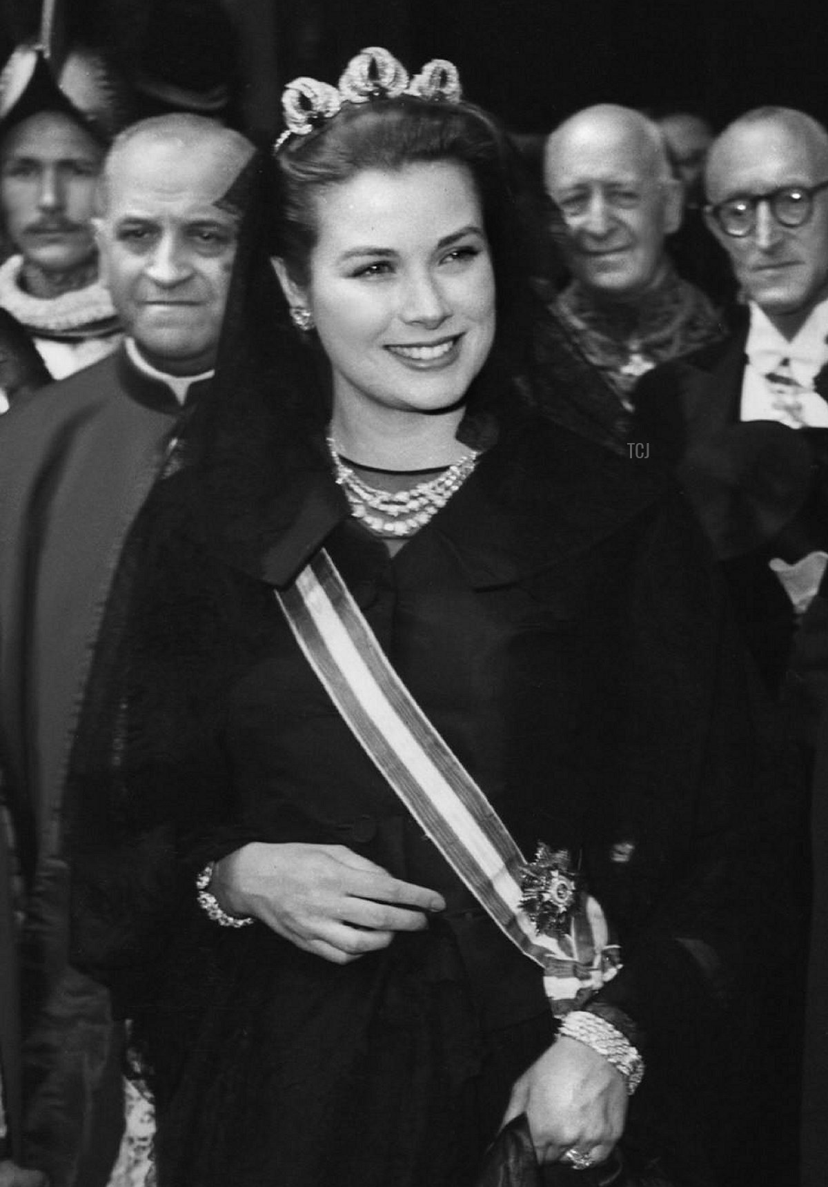 Princess Grace frequently wore the jewel as a tiara. Here, she wears the tiara (with diamond bracelets, diamond earrings, and her diamond festoon necklace) for a visit to the Vatican in April 1957.