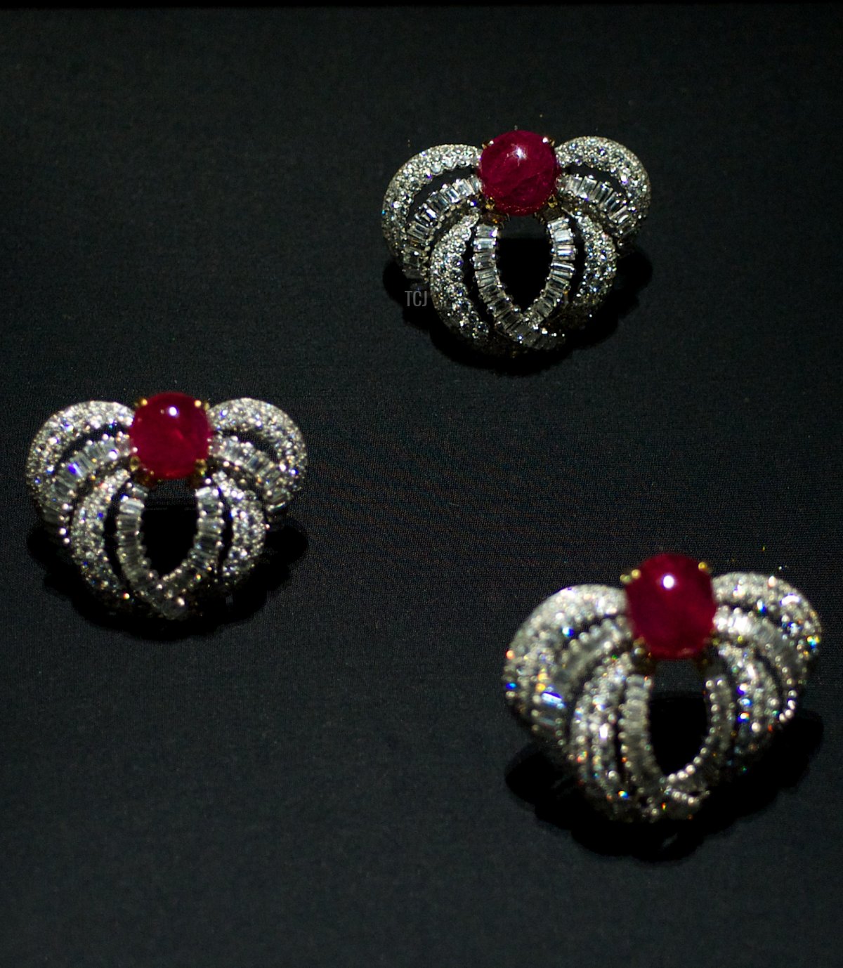 The jewel, as the name suggests, was a gift from the Société des Bains de Mer, one of the most important institutions in the principality. (It owns, among other things, the casino and the Hotel de Paris.) The piece features three modern ornaments (pictured above) set with diamonds and cabochon rubies. They can be set atop the tiara, or worn separately in various ways, including as brooches, hair ornaments, or pendants on a necklace.
