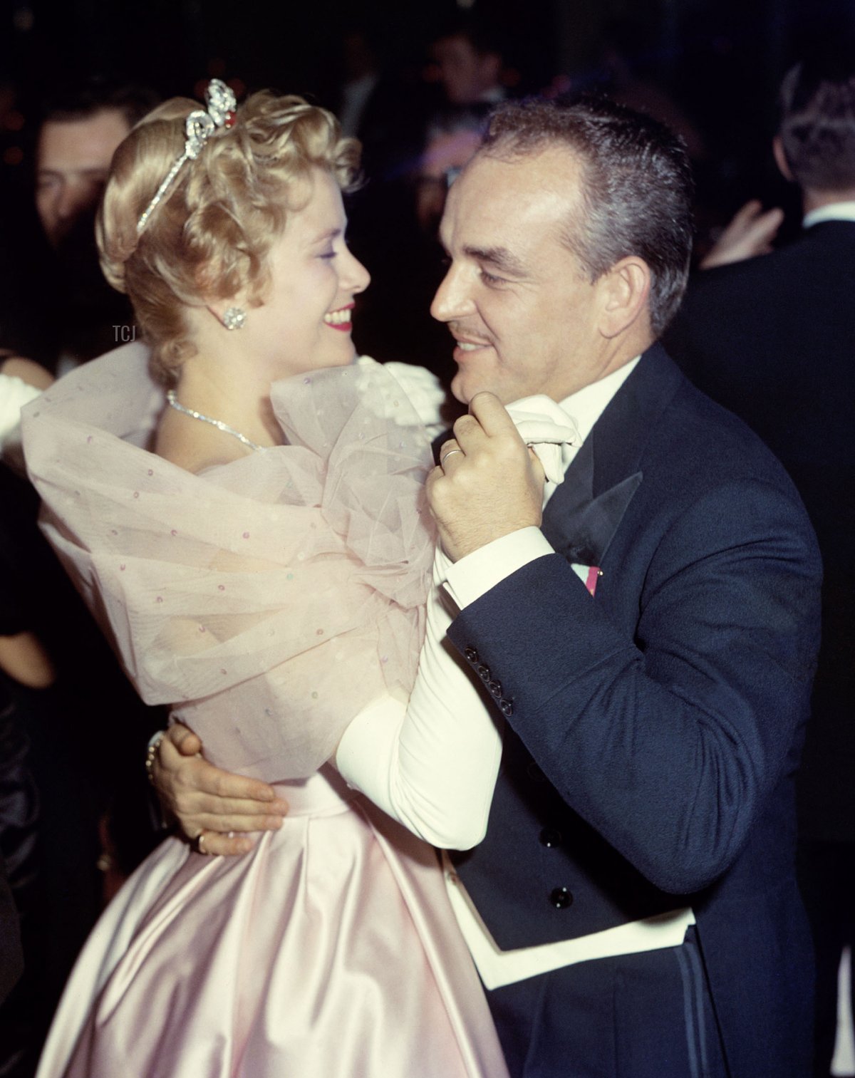 And here, in a rare color photo, Grace wears the tiara as she dances with Rainier at the Imperial Ball in New York in December 1958.