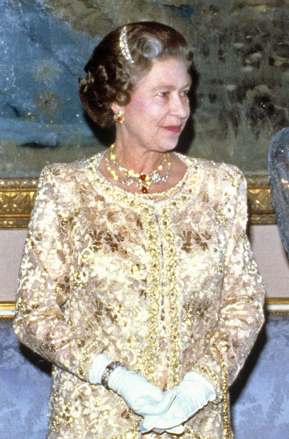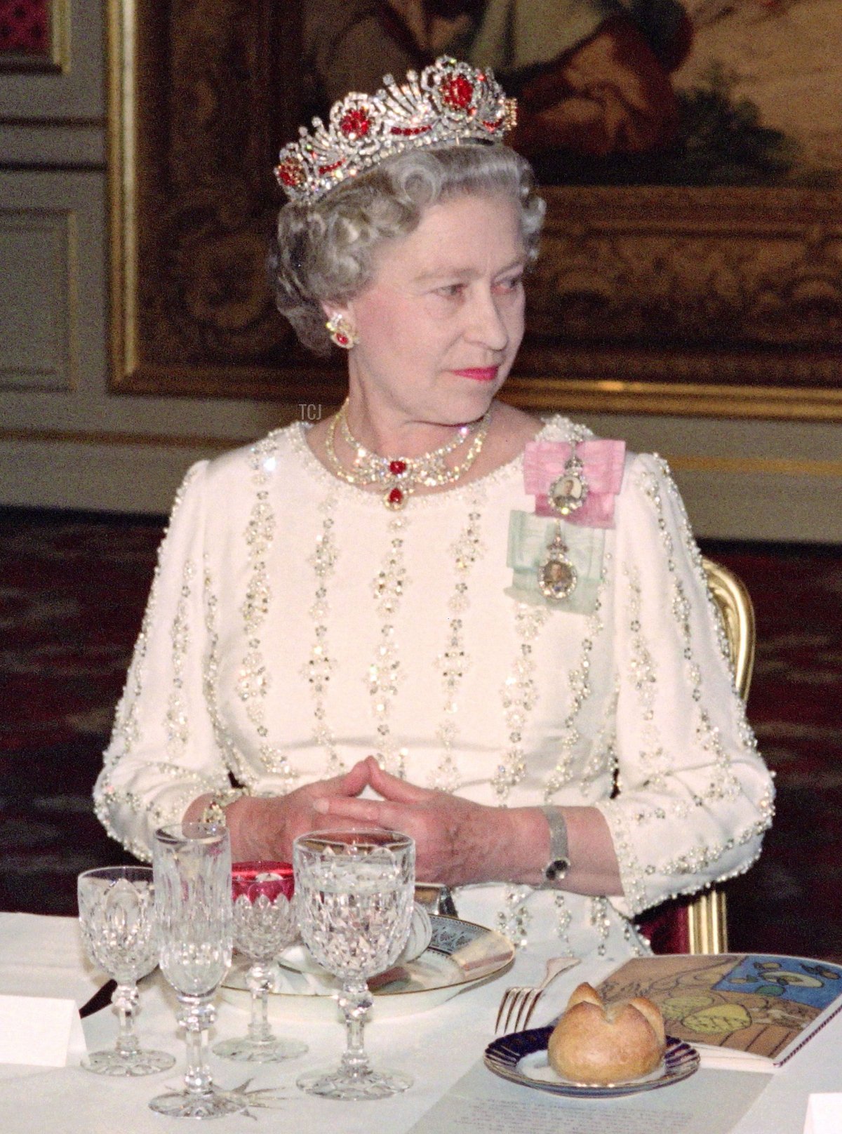 In June 1992, she brought the rubies with her on a state visit to France. She wore them with the Burmese Ruby Tiara and her Art Deco-style ruby and diamond bracelet for a dinner at the Élysée Palace in Paris during the trip.