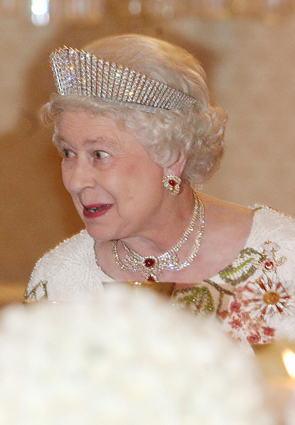 The Queen’s most prominent recent appearances in the suite took place during gala occasions about a decade ago. She paired the rubies with Queen Alexandra’s Kokoshnik for a state banquet in May 2008 during her state visit to Turkey.