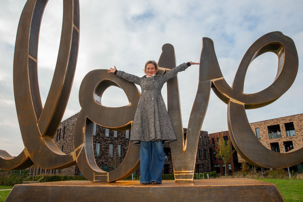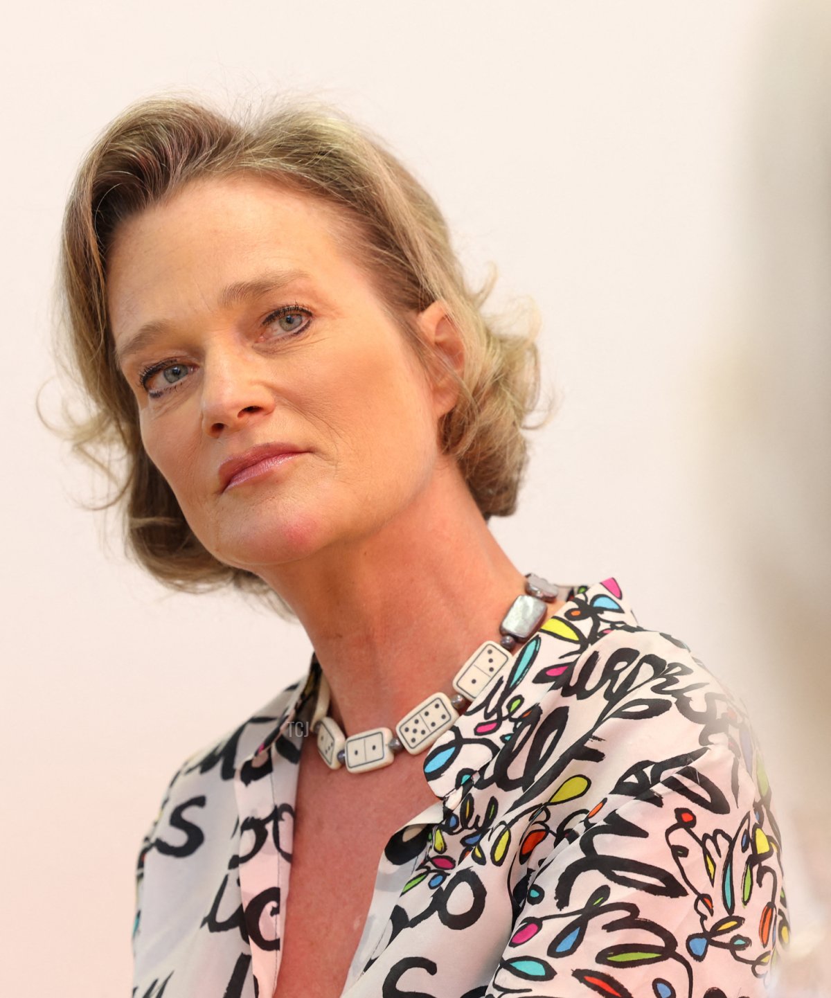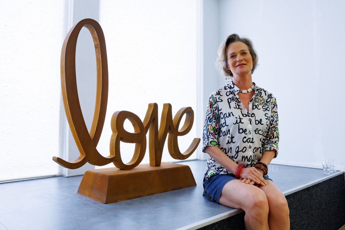 Princess Delphine of Belgium, half-sister of King Philippe, participated in a special conversation during the festival, which also showcased an exhibition of her modern art. She poses with one of her sculptural pieces in the photograph at the top of this article.