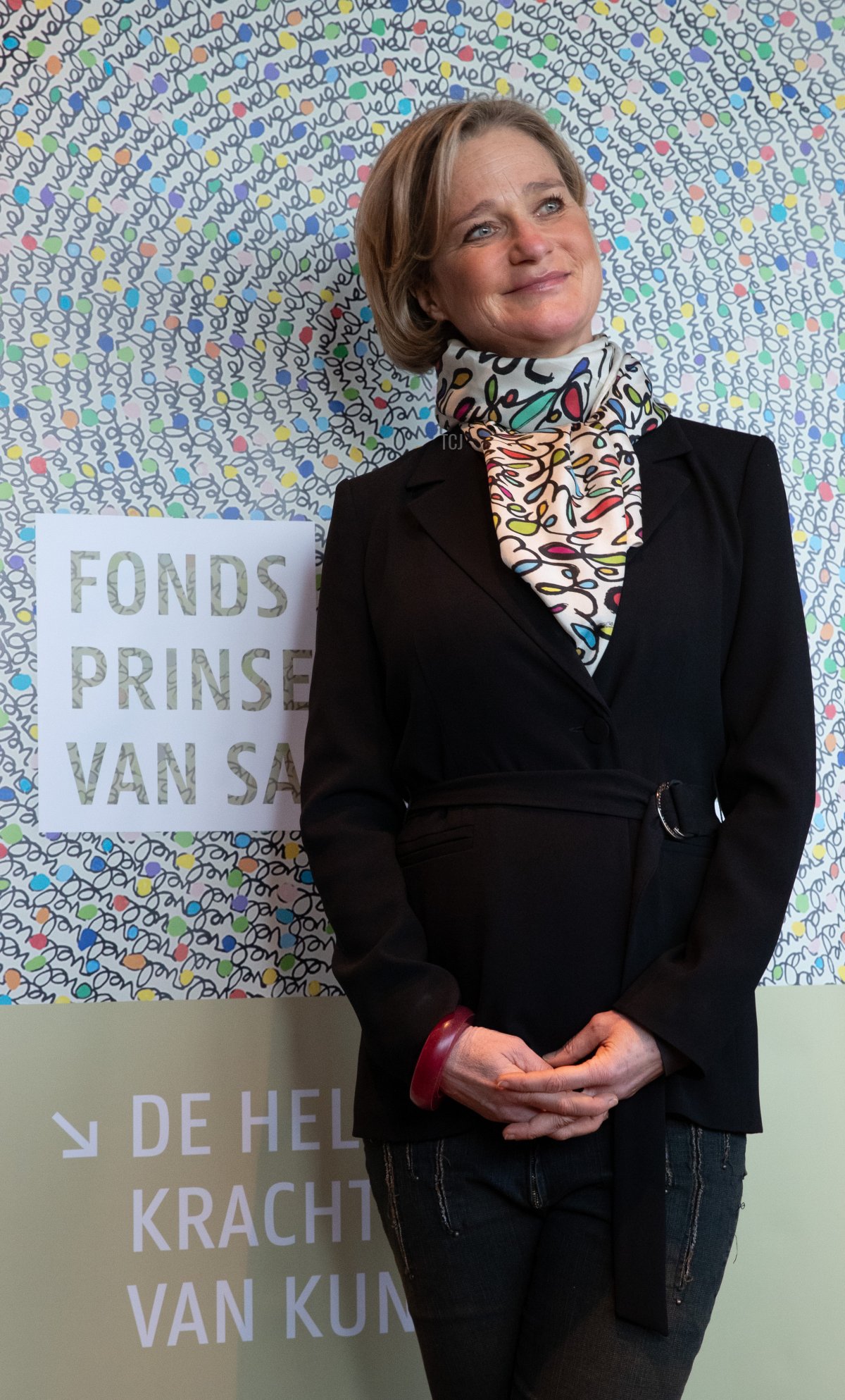 And here, in December 2020, she wears a silk scarf printed with her artwork as she stands in front of the official logo of her new charity foundation, the Fonds Prinses Delphine van Saksen-Coburg, at the University Hospital in Ghent. The foundation supports the integration of art into the world of healthcare.