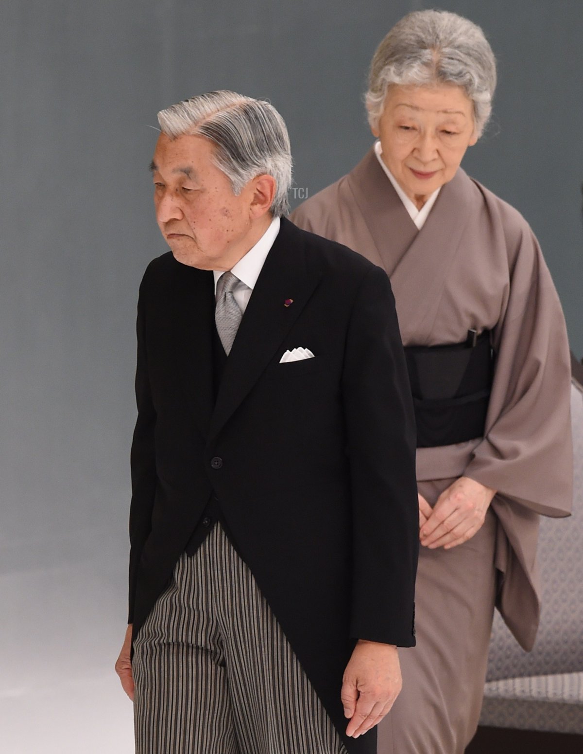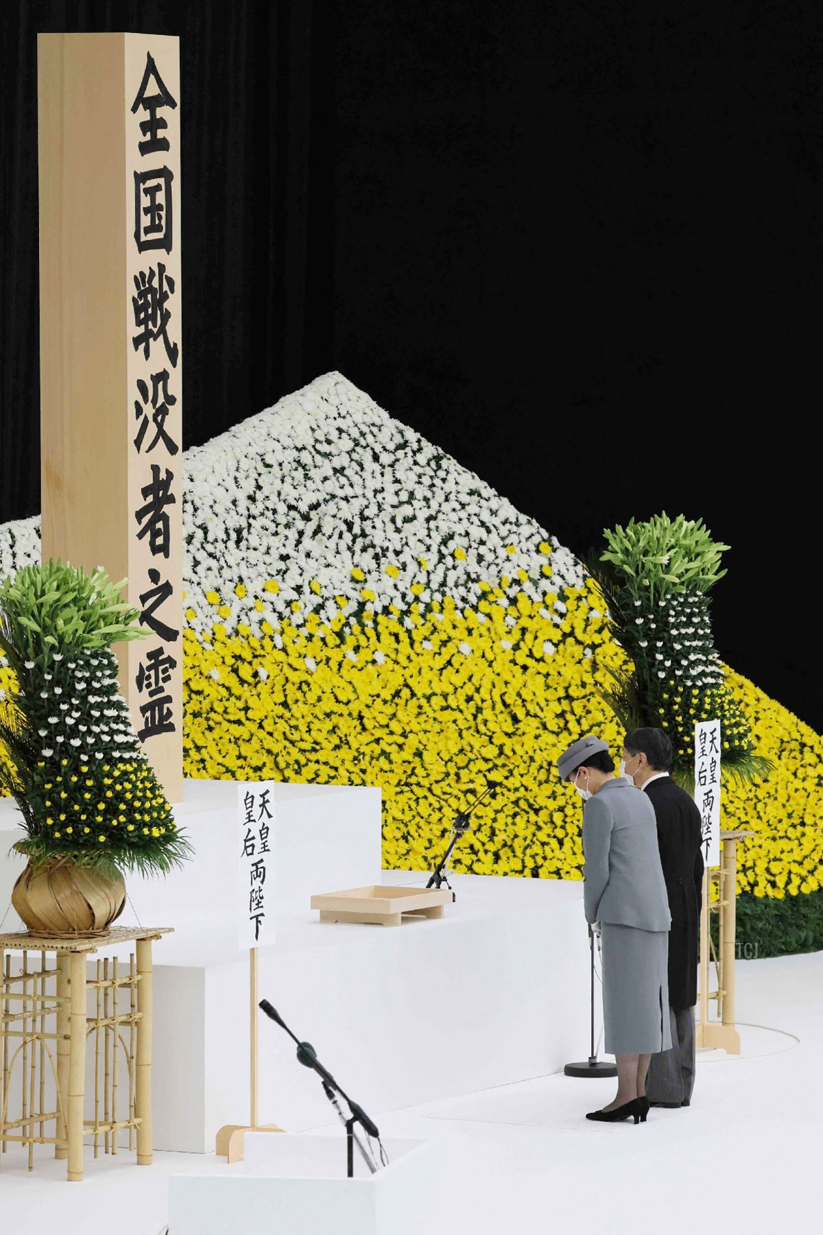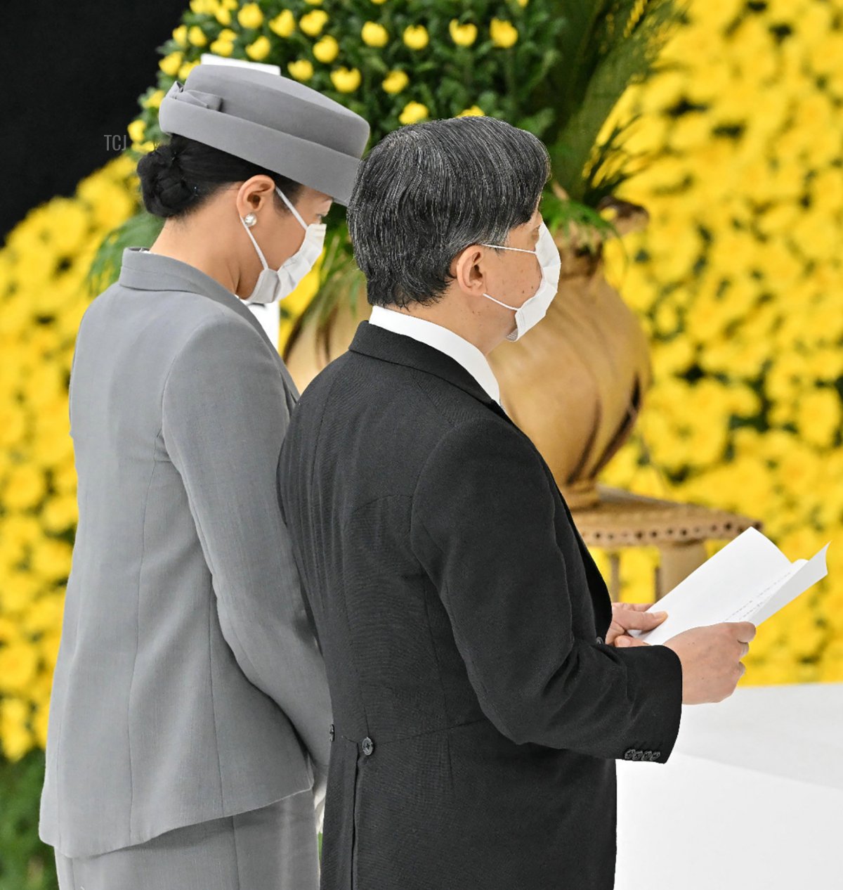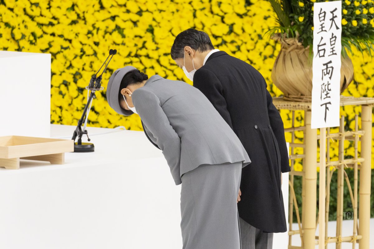 The Emperor and Empress attend the ceremony each year. Here, Emperor Naruhito delivers a speech during the ceremony, with Empress Masako standing at his side.