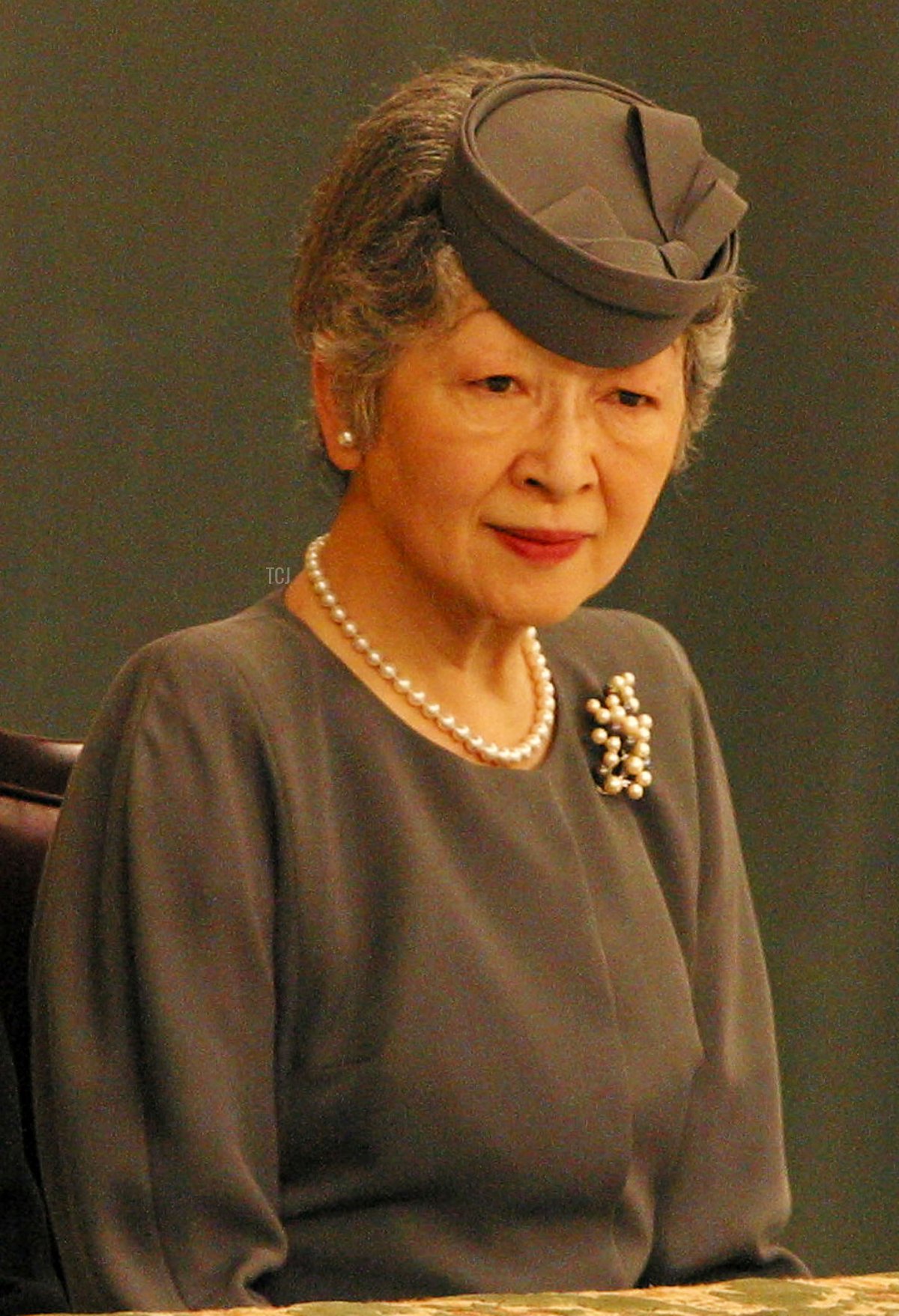 The previous empress consort, Empress Michiko, also wore similar clothing and jewels for the memorial ceremony during her husband’s reign, though there was a little more variation in her attire at times. Here, at the ceremony in August 2003, she wears an elegant gray suit and hat with pearls, including a modern pearl brooch.