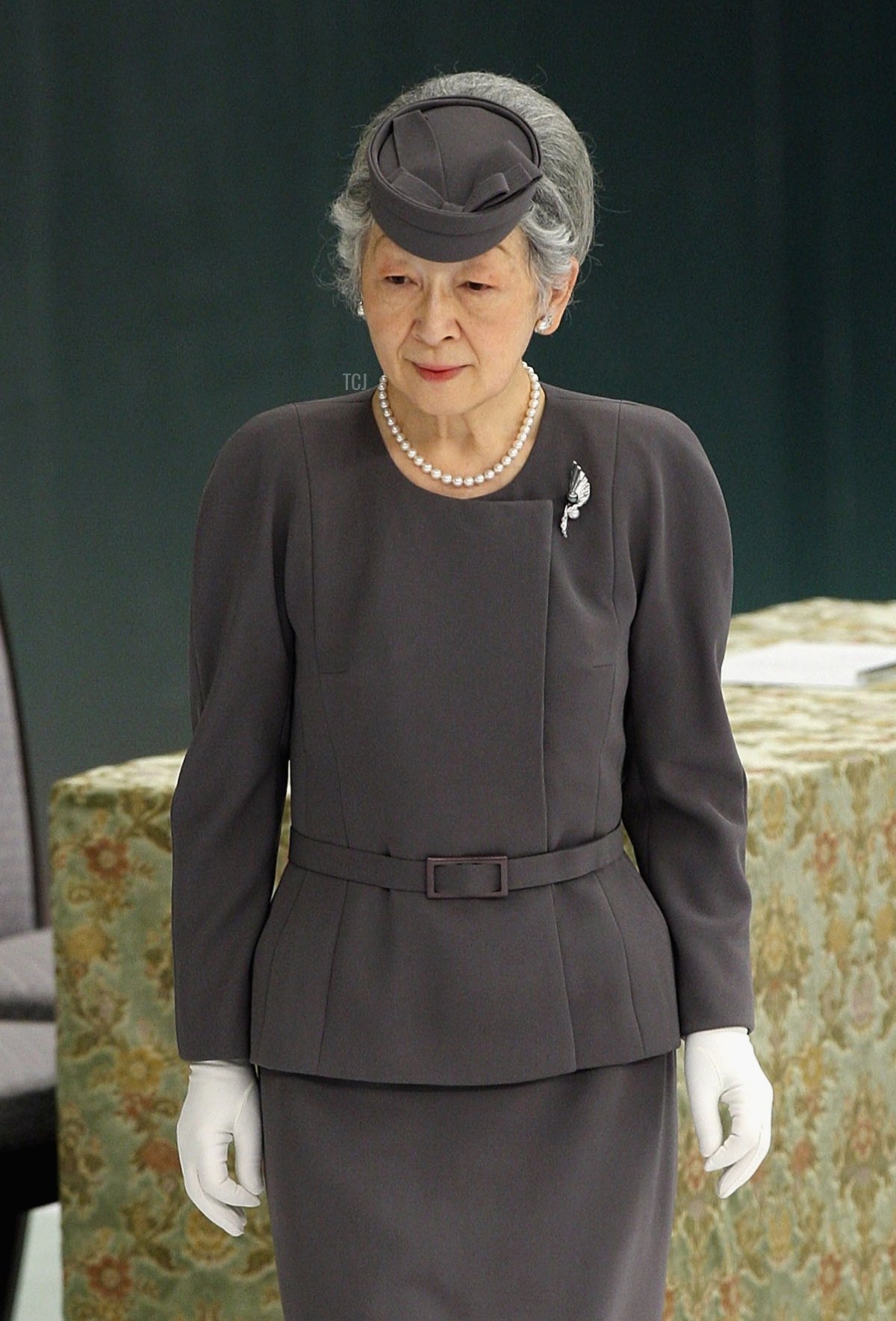 Empress Michiko also sometimes wore more traditional Japanese clothing for the ceremony. Here, she wears a gray kimono for the service in August 2014.