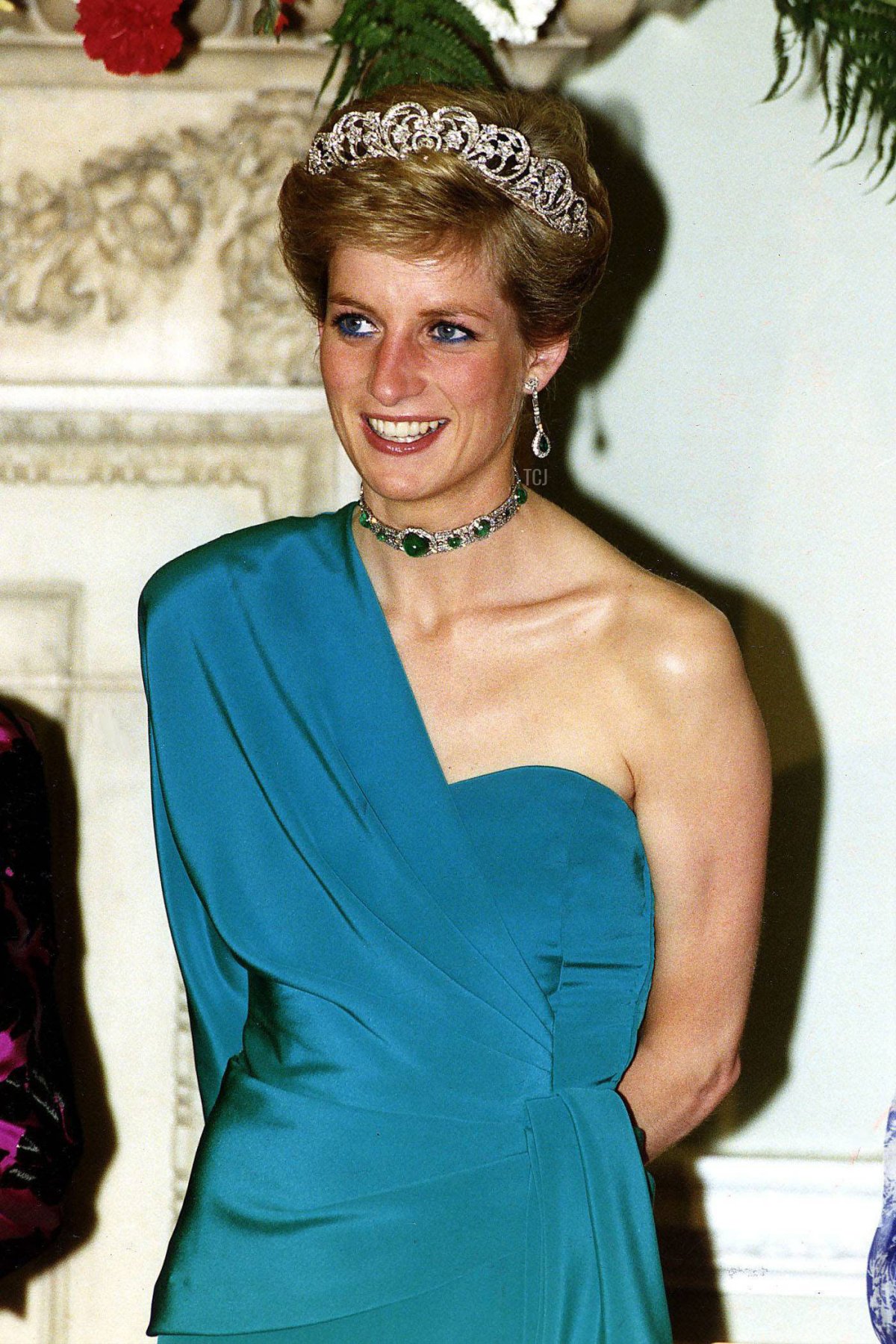 On June 21, 1989, the Prince and Princess of Wales attended a dinner given by the Corporation of London at Mansion House in honor of visiting Australian Prime Minister Robert Hawke. Diana wore a teal Catherine Walker gown with a dramatic single sleeve design, paired with a matching clutch bag and shoes.