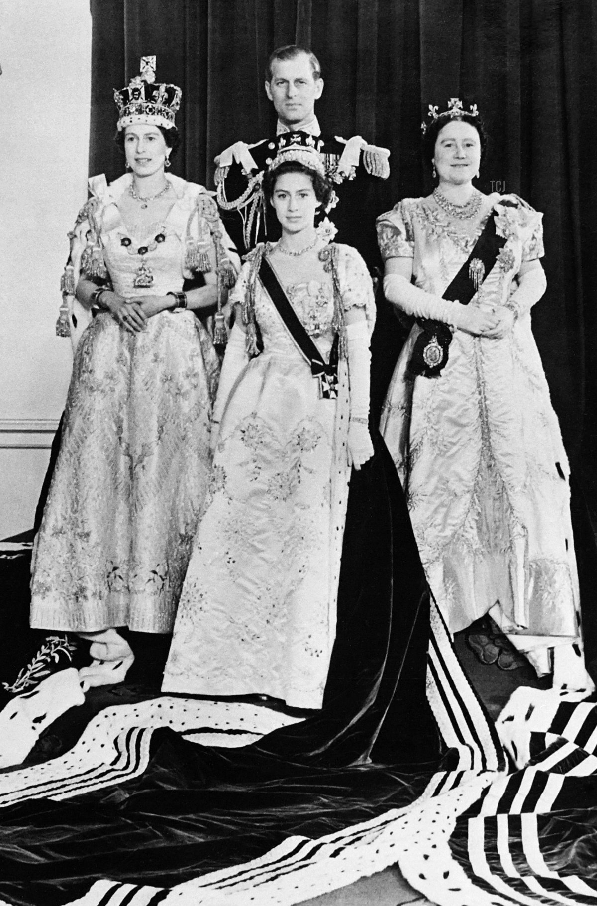 Margaret and her mother were also included in lots of different photographic images taken on Coronation Day. Here, the Queen poses for a portrait after the coronation at Buckingham Palace with her immediate family: her husband, the Duke of Edinburgh; her mother, Queen Elizabeth the Queen Mother; and her sister, Princess Margaret.