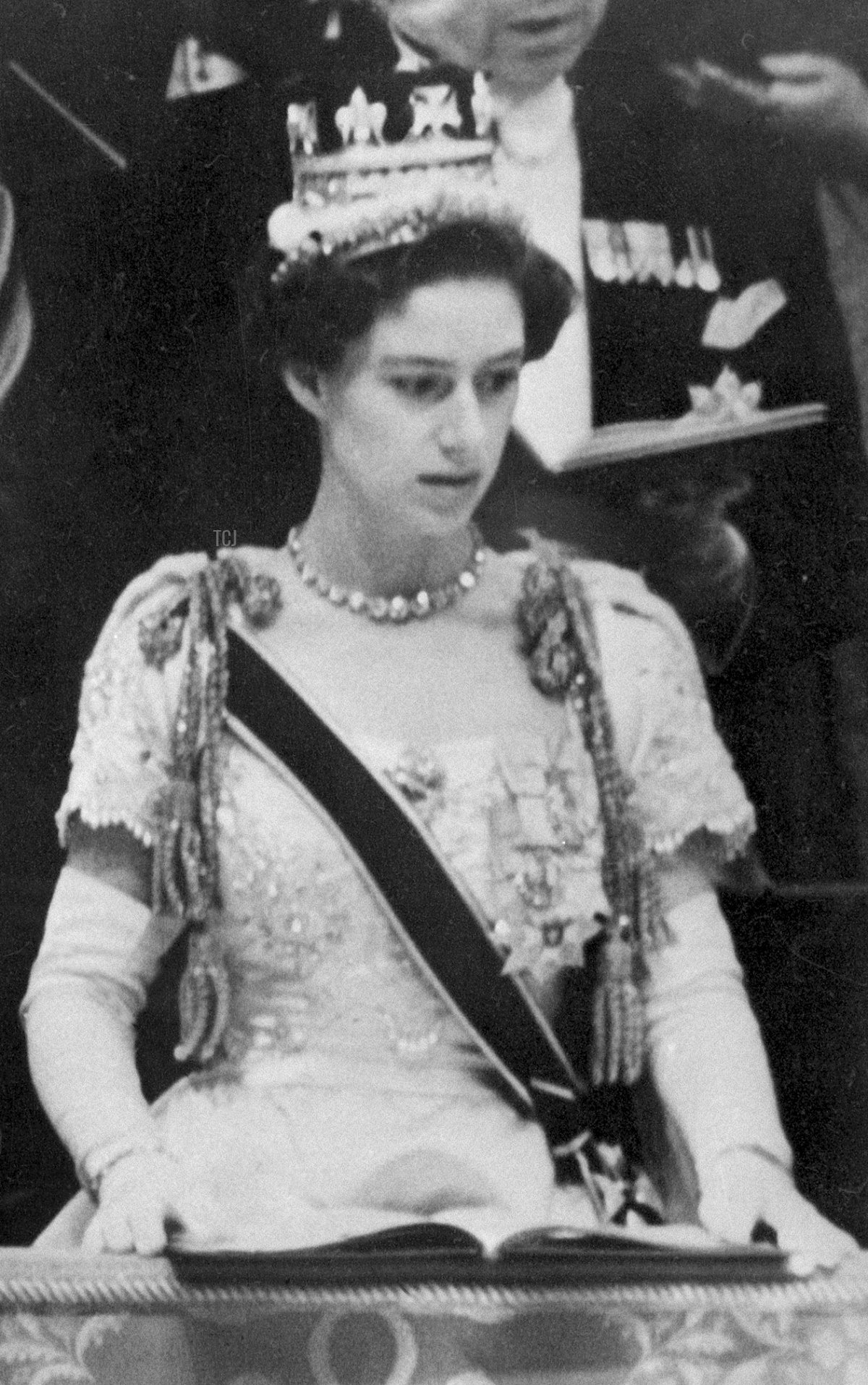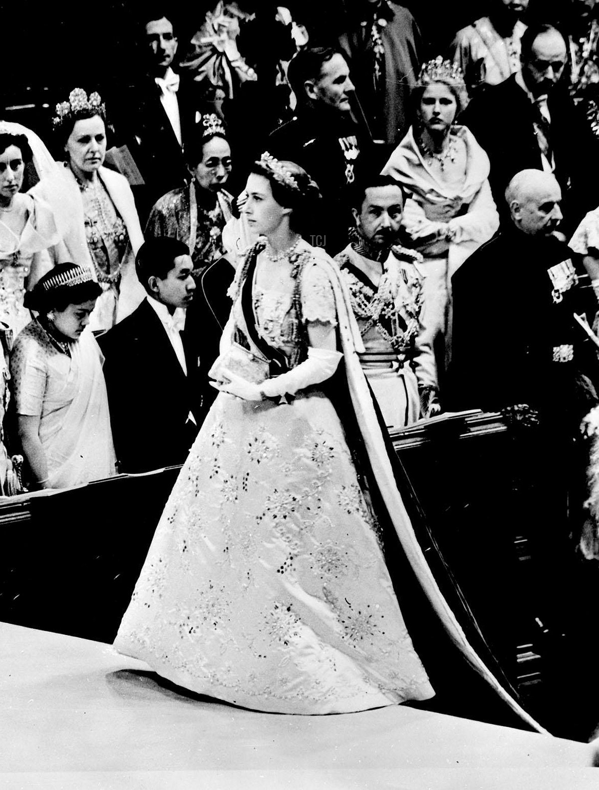 Like the new Queen herself, both the Queen Mother and Princess Margaret wore elaborate gowns made by Norman Hartnell for the coronation. Here, Margaret arrives at Westminster Abbey in her gown, robes, and jewels for the ceremony. (You’ll spot foreign royals and dignitaries behind her, including the future Emperor Akihito of Japan. Beside him, Princess Princep of Nepal wears a dazzling diamond fringe tiara.) Margaret’s Hartnell gown was richly embroidered. The designs featured included daisies (marguerites) and roses, references to her name, Margaret Rose.
