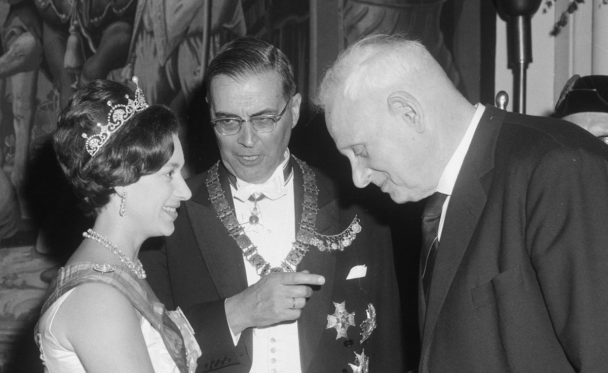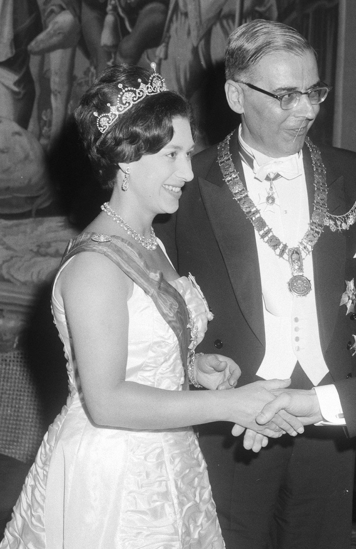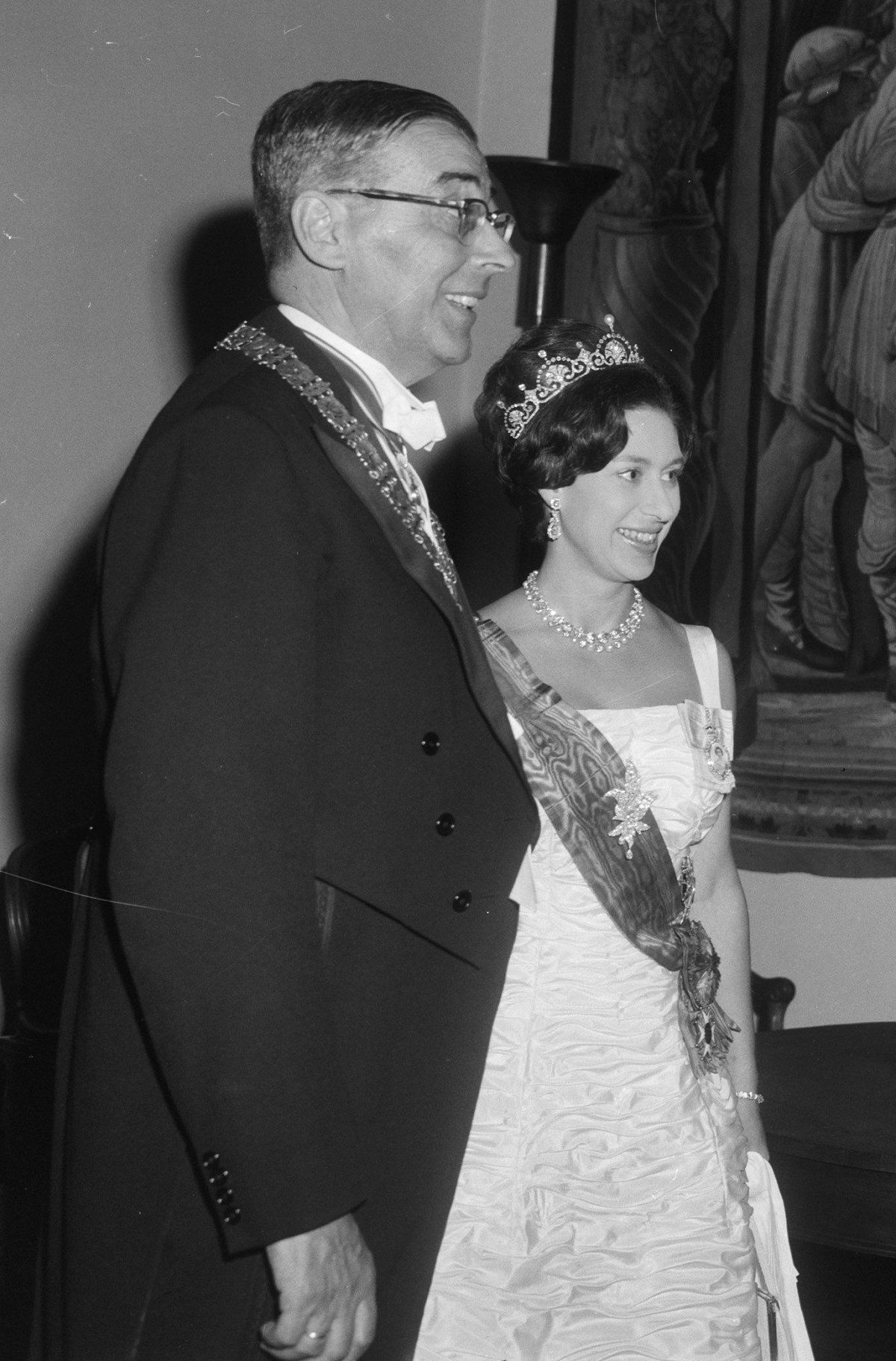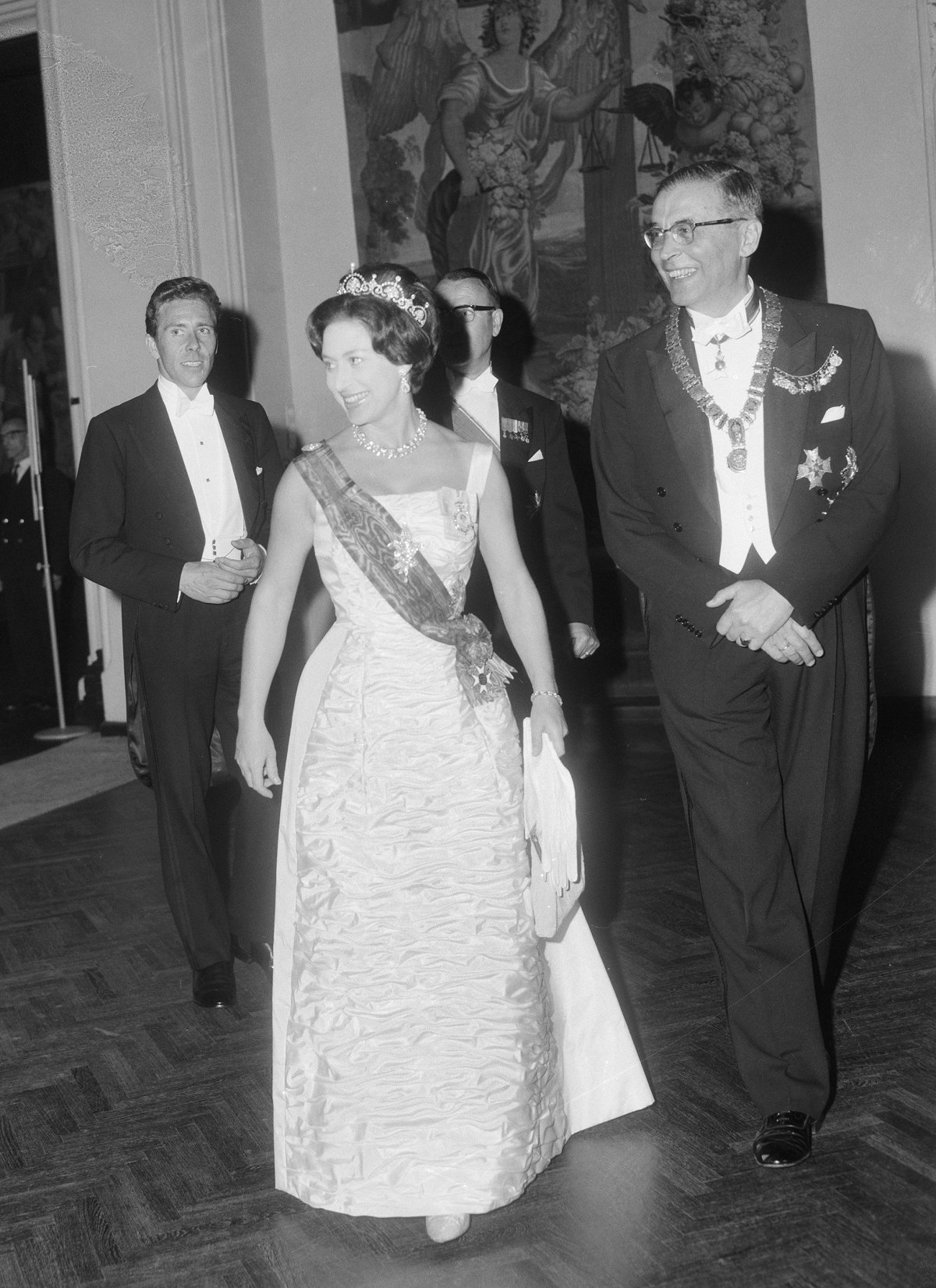 The couple was escorted at the reception by Gijs van Hall, the Dutch statesman and resistance fighter who served as Mayor of Amsterdam from 1957 until 1967. Princess Margaret wore the insignia of the Order of the Netherlands Lion, which she received during her official 1948 visit for the inauguration of Queen Juliana, and Queen Elizabeth II’s Royal Family Order.
