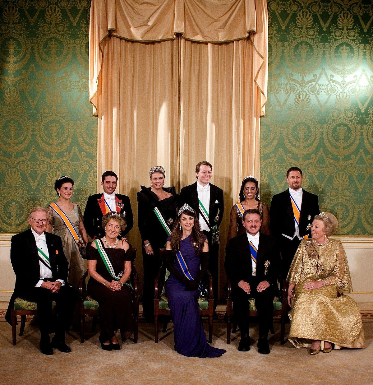 There were lots of tiaras present: Queen Beatrix wore the Antique Pearl Tiara, while Princess Margriet wore the pearl setting of the Dutch Emerald Parure Tiara and Princess Laurentien wore the Dutch Laurel Wreath Tiara. And two more Jordanian princesses were also present and decked out in diamond tiaras. On the left in the second row is Princess Noor, who was then the wife of Prince Hamzah, and second from the right is Princess Rahma, the king’s cousin. Noor appears to have worn a diamond ribbon tiara that may belong to Queen Noor, while Rahma wore a tiara that may belong to her mother, Princess Sarvath.