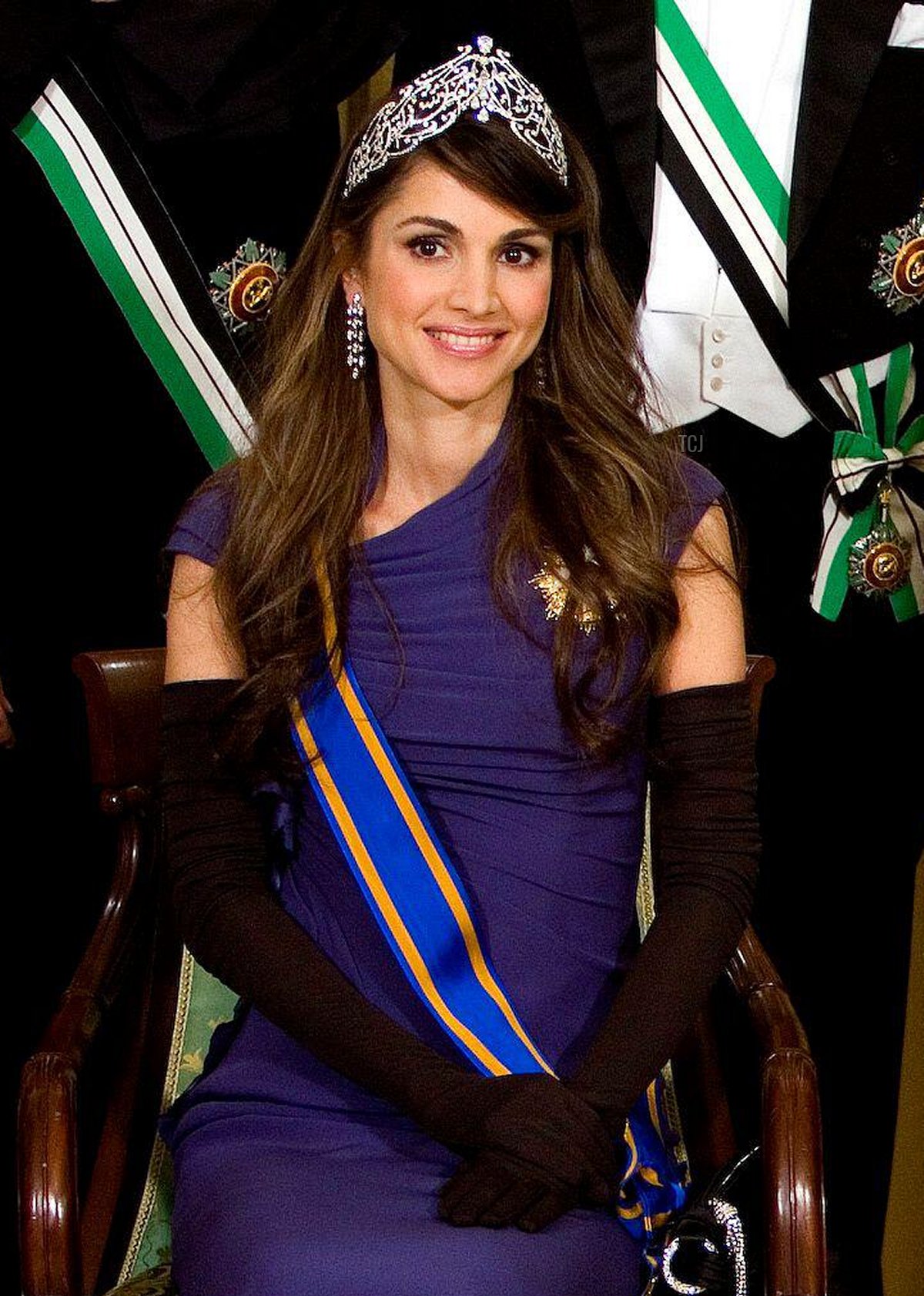 Queen Rania wore a deep blue dress for the evening with black gloves and accessories. This photograph appears to lighten the color of the dress a bit. She has the sash and star of the Order of the Netherlands Lion pinned to her gown.