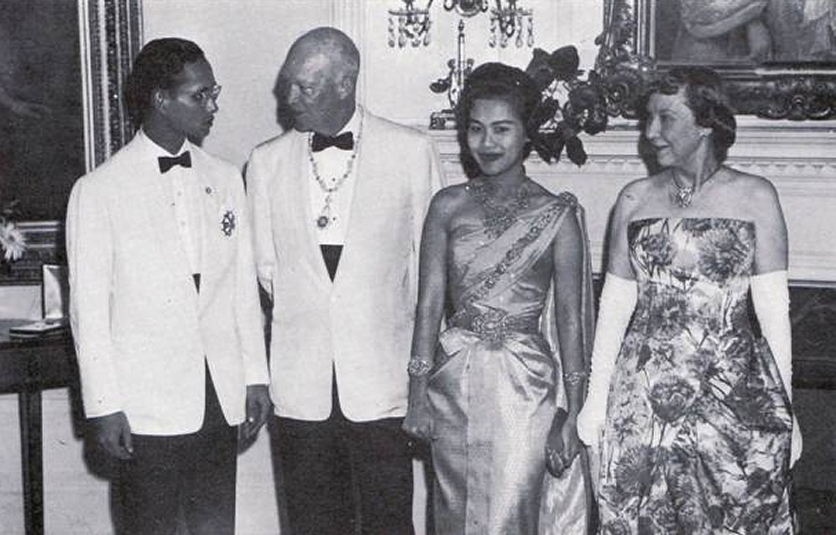 Eisenhower greeted the couple at National Airport on their arrival, which took place on June 28. The King wore a white military uniform to greet his fellow head of state, while Queen Sirikit wore a pink suit. The King was full of praise for his trip so far, telling Eisenhower that the United States was “half [his] motherland.” It was true—Bhumibol Adulyadej was born in 1927 in Cambridge, Massachusetts, where his father was at student in Harvard’s public health program. Mrs. Eisenhower didn’t join her husband at the arrival ceremony, as she was recovering from a recent bout of bronchitis, but she did rally to make an appearance at a state dinner at the White House later that evening. Sirikit wore a traditional Thai gown embroidered with gold metallic thread and gold filigree jewels for the dinner, while Mamie was daring in a strapless floral gown and long white gloves.