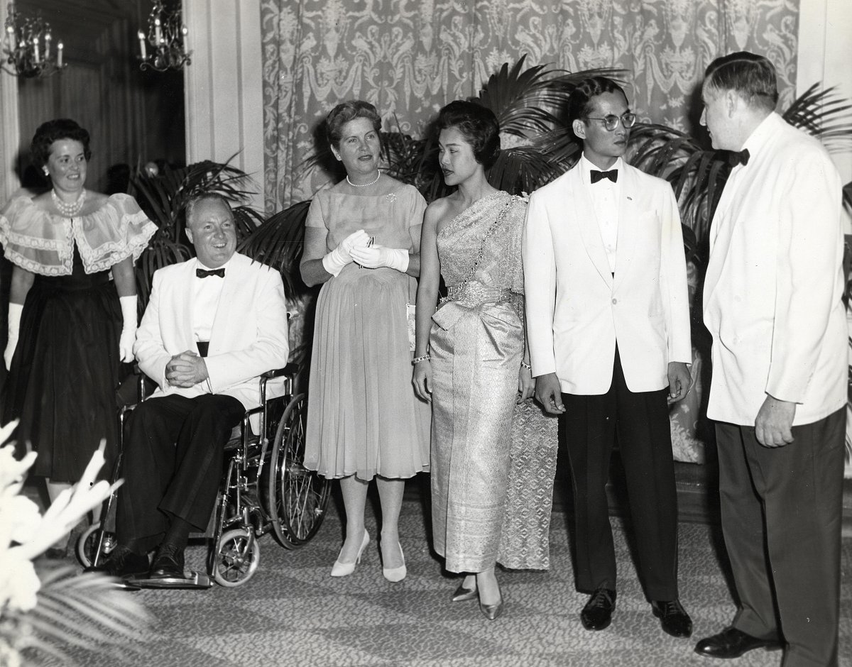 The royal couple departed from Bangkok on June 14, 1960, bound for their first stop in the United States: Honolulu. After touring the Hawaiian islands, their month-long journey across the United States took them next to California, where they visited Disneyland and toured movie studios in Los Angeles. The couple’s four young children met them in California, where they would stay on a Pomona ranch for the duration as their parents hopped from city to city during the tour. After a week in Southern California, the King and Queen boarded President Eisenhower’s plane, the Columbine II, stopping in Pittsburgh before heading on to Washington, D.C.
