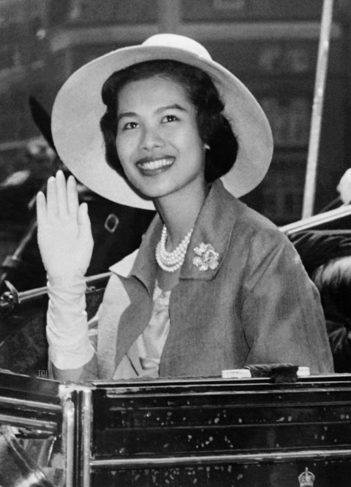 The royal couple had a break after their lengthy United States tour—but only a brief one. Five days later, on July 19, 1960, the King and Queen boarded a plane for London via Geneva, touching down at Gatwick Airport. There, they were met by a member of the royal family who had also become a close friend: Princess Alexandra. She had made the acquaintance of the couple in 1959, and their friendship would endure over the decades. The Thai royals were greeted in the traditional British manner: with rain. Sirikit got to use one of her custom-made Balmain raincoats, in a shade of pale gray that coordinated with her purple suit.