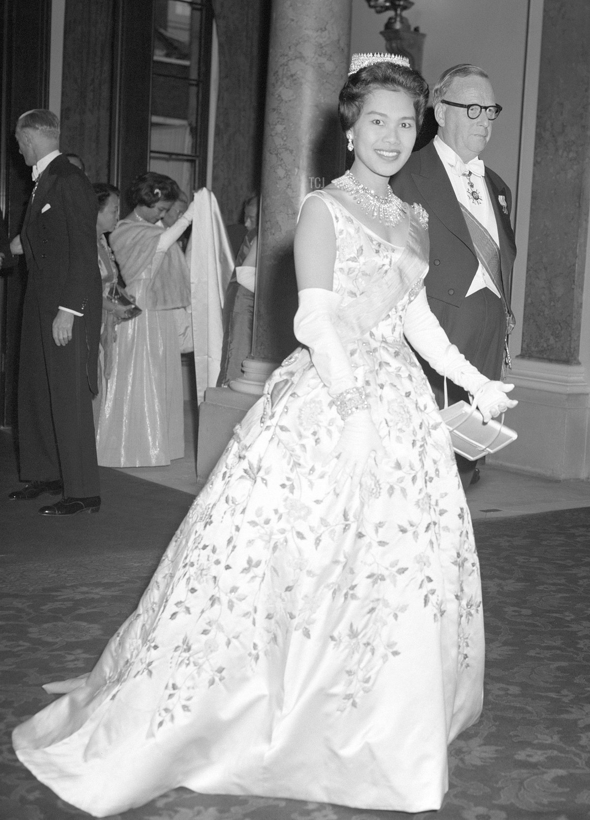 The royal trio were met at Victoria Station in London by the Queen and the Duke of Edinburgh, who rode with them in carriages to Buckingham Palace. The Queen’s outfit was described as “moss green” by the press. She wore a matching hat decorated with pink and red roses, plus the Williamson Pink Diamond Brooch. Following their welcome at the palace, the Thai royal couple took a private tour of Westminster Abbey. That evening, everyone changed into their finest white-tie attire for a grand state banquet at Buckingham Palace. Pierre Balmain had reportedly designated “the most magnificent gown” from the tour wardrobe to be worn for this particular occasion.