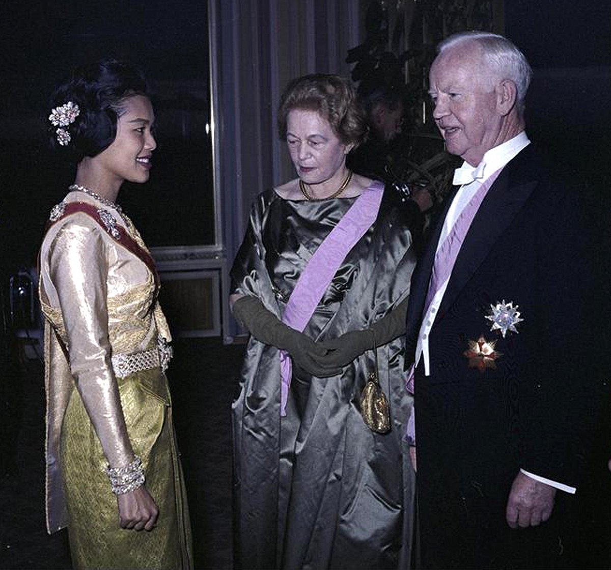 After returning to Geneva, the couple relaxed for three weeks before resuming their whistlestop tour of Europe. Three days in Lisbon were followed by three more days of official visiting in Bern and Lausanne. From there, it was off to Copenhagen, where they were hosted by King Frederik IX and Queen Ingrid of Denmark for three days at the beginning of September. Next, King Olav V and the Norwegian royal family (including Crown Prince Harald and Princess Astrid) hosted the couple for three days in Oslo, and then King Gustaf VI Adolf and Queen Louise welcomed the couple to Sweden a few days later. In Rome, Queen Sirikit wore her traditional Thai tiara with sparkling diamonds and an embroidered gown for a reception at the Quirinal Palace. The visit, hosted by President Giovanni Gronchi, also included a tour of the Borghese Museum and a visit to the local Red Cross center. (Sirikit has been the honorary president of the Thai Red Cross since 1956.)