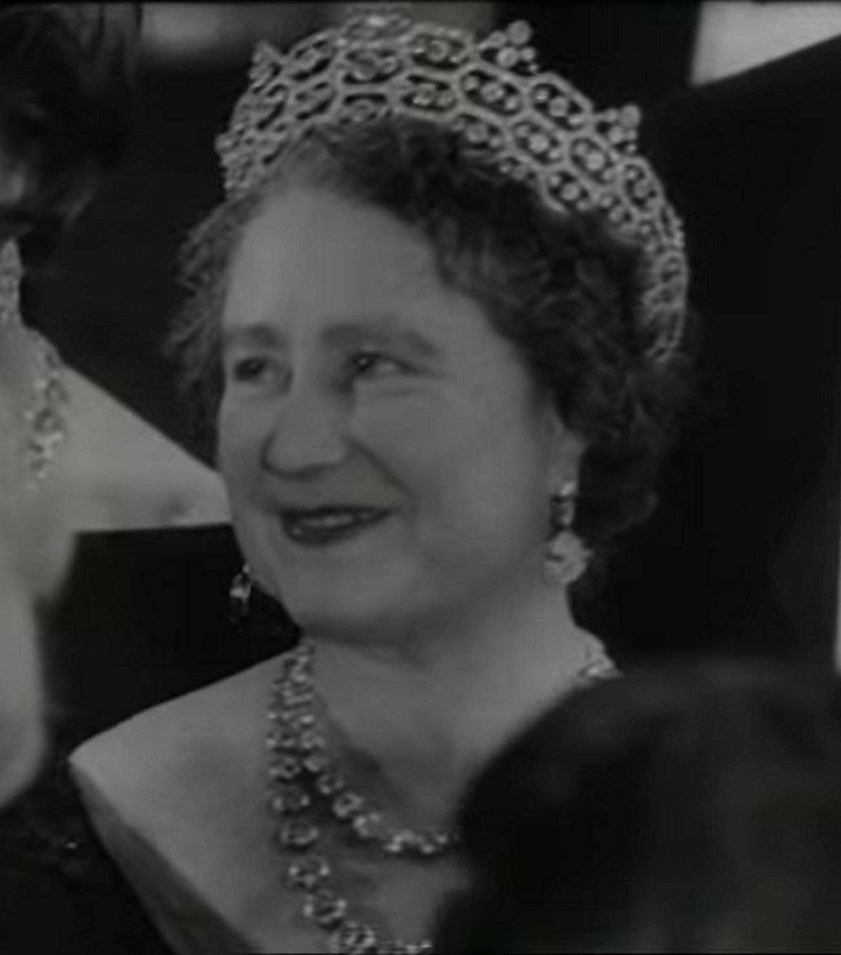 Here’s another view of the Queen Mother’s tiara, earrings, and necklace from the film premiere. The longer of the two necklaces is the one given to her as a coronation gift by her husband, King George VI. It was most recently worn by the Duchess of Cornwall, who also wears the Greville Tiara. The peardrop earrings were most recently seen on the Queen.