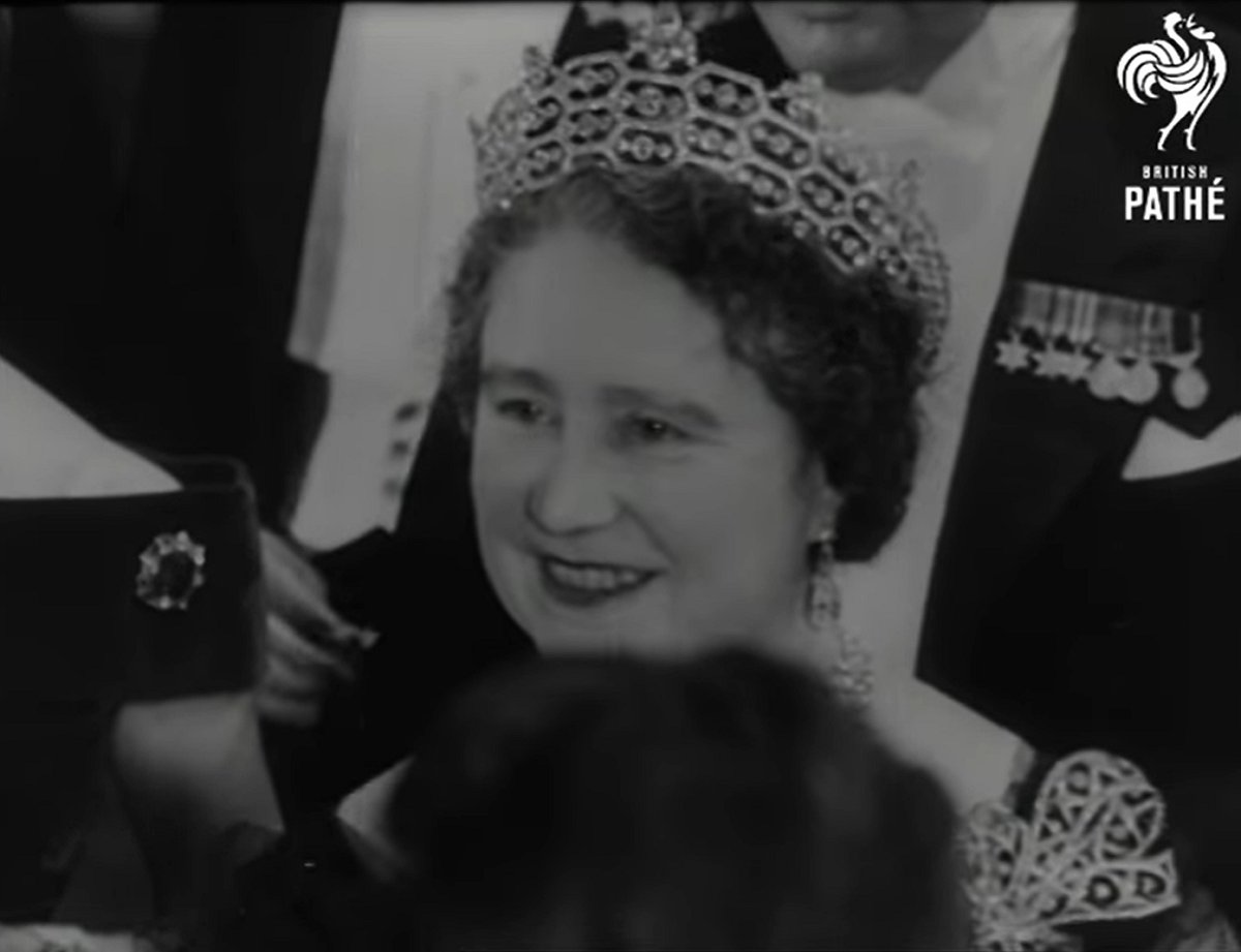Elizabeth’s most notable public appearance in the brooch came more than a decade later, after she had been widowed and taken on the new role of Queen Mother. In February 1961, she attended the Royal Film Performance of The Facts of Life, a romantic comedy starring Bob Hope and Lucille Ball. She wore a glamorous gown of black tulle as she greeted various film stars in attendance, including Van Johnson, Warren Beatty, and Joan Collins.