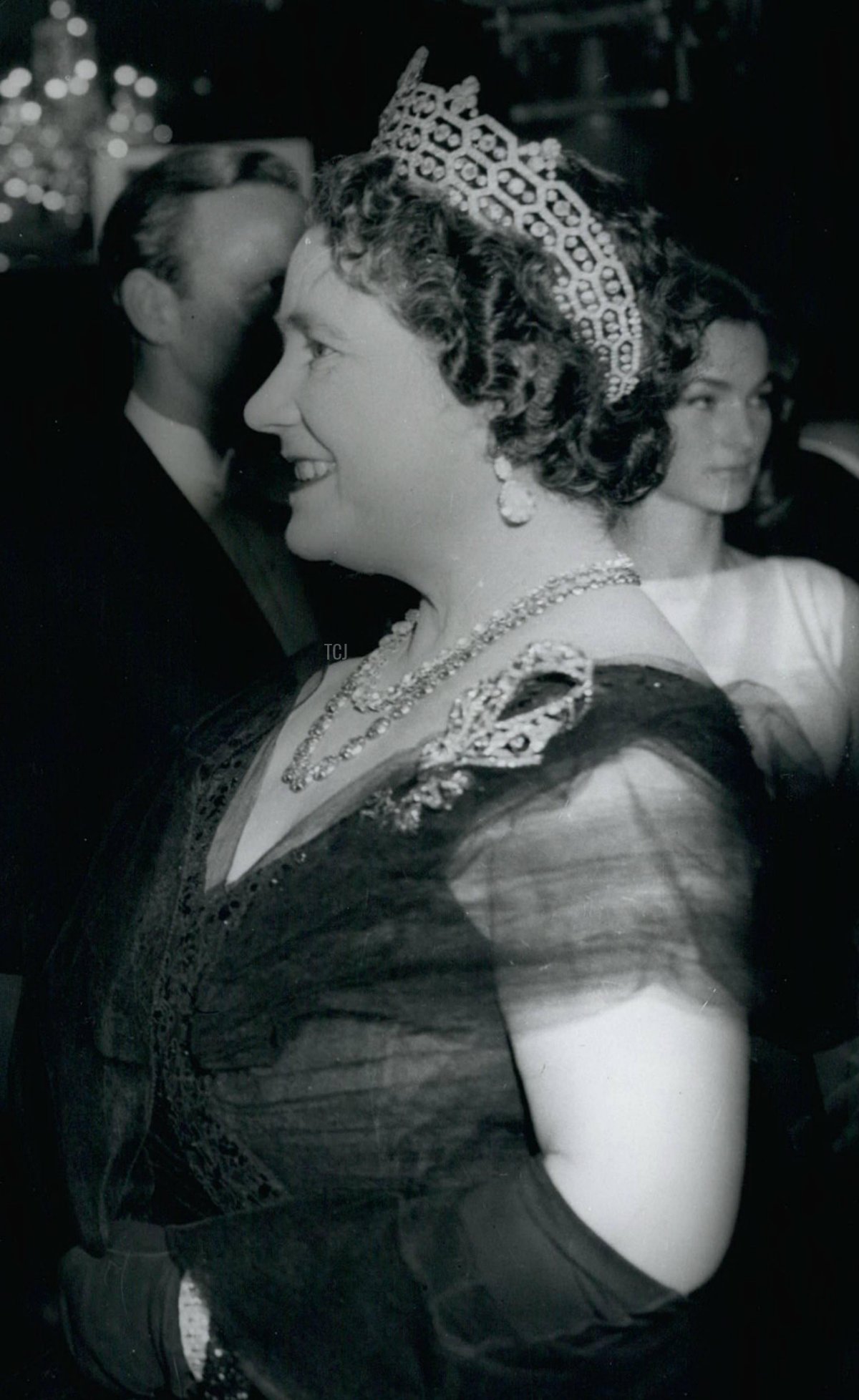 Here’s another view of the Queen Mum’s jewels from the evening. This photograph really gives you an idea of the scale of the bow brooch. You also get a glimpse of a diamond bracelet on her left wrist—I think this is Queen Mary’s Choker Bracelet, now worn by the Duchess of Cambridge.