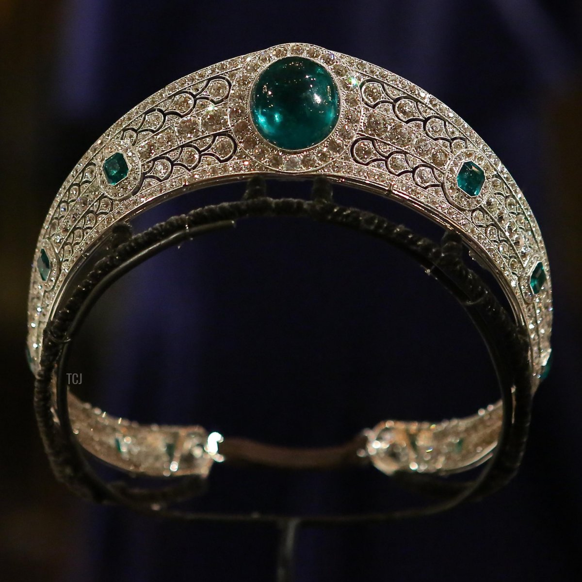 The tiara is an exquisite example of early ’20s Art Deco design. The smooth diamond and platinum lines of the kokoshnik are interrupted by scalloped sections that echo the round cabochon shape of the piece’s central emerald cluster. That emerald measures at a whopping 93.70 carats. Six more (faceted) emeralds are set at regular intervals on each side of the tiara, which tapers pleasantly as it nearly encircles the wearer’s head, for a total of thirteen emeralds in the piece.