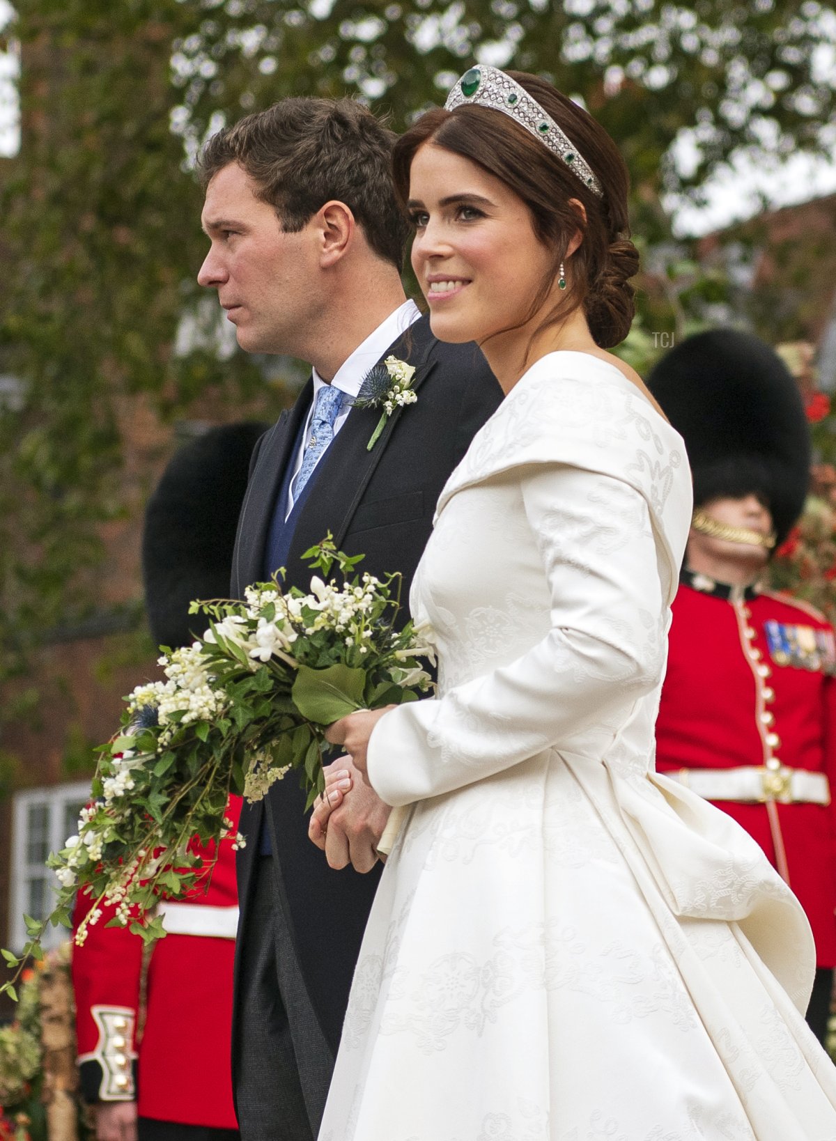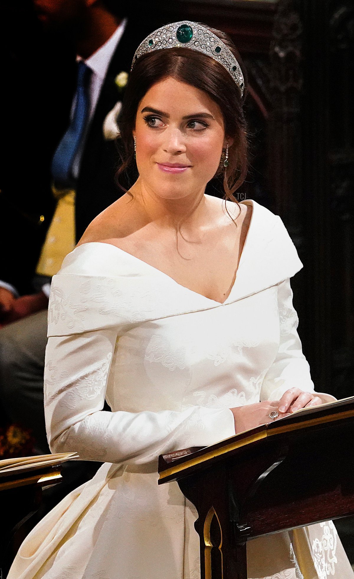 Eugenie paired the jewel with a gown designed by Peter Pilotto and Christopher De Vos and emerald earrings gifted by the groom.