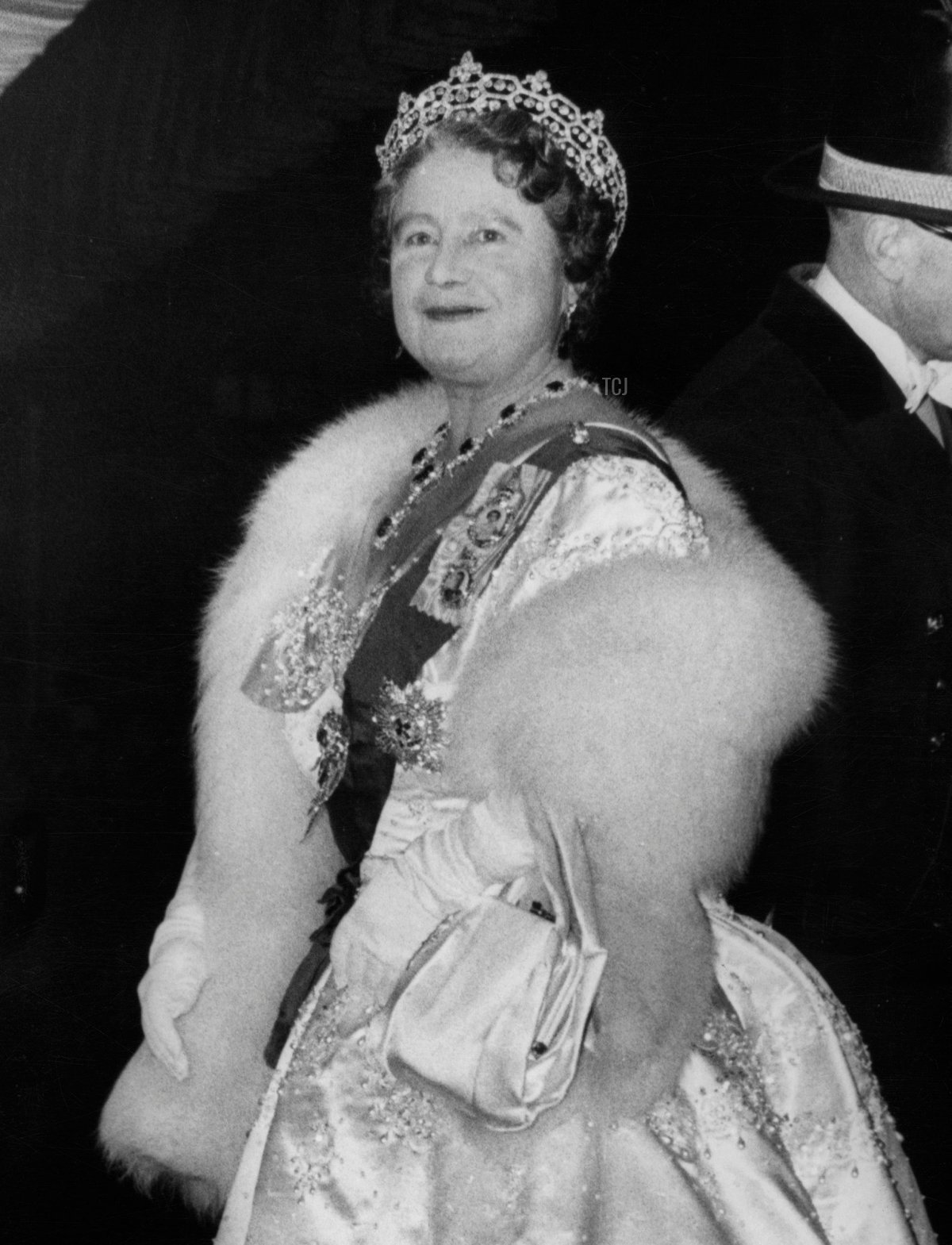 Like so many of the pieces from the Greville bequest, Elizabeth began wearing the emerald and diamond necklace in the years after World War II. This appearance—a ballet performance of Cinderella at the Royal Opera House in Covent Garden in the spring of 1949—appears to be one of Elizabeth’s earliest outings in the necklace. For the occasion, she paired the jewel with the emerald earrings from the bequest and Queen Mary’s Fringe Tiara, plus an Art Deco-style bracelet set with diamonds and emeralds. In these early years, Elizabeth would experiment with the emeralds, pairing the necklace with different diamond tiaras from her collection, including this fringe, the Teck Crescent Tiara, and the Greville Tiara.