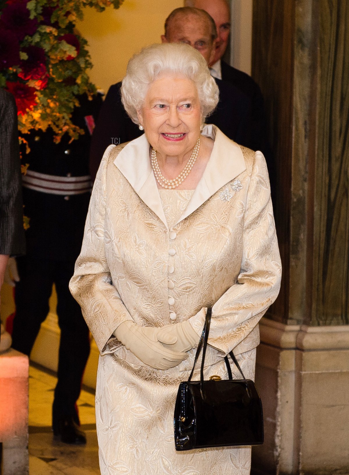 It’s a little tougher at first to see the brooches on the champagne-colored jacket that the Queen wore for a reception at the Royal Academy of Arts in London in October 2016, but they’re definitely there!