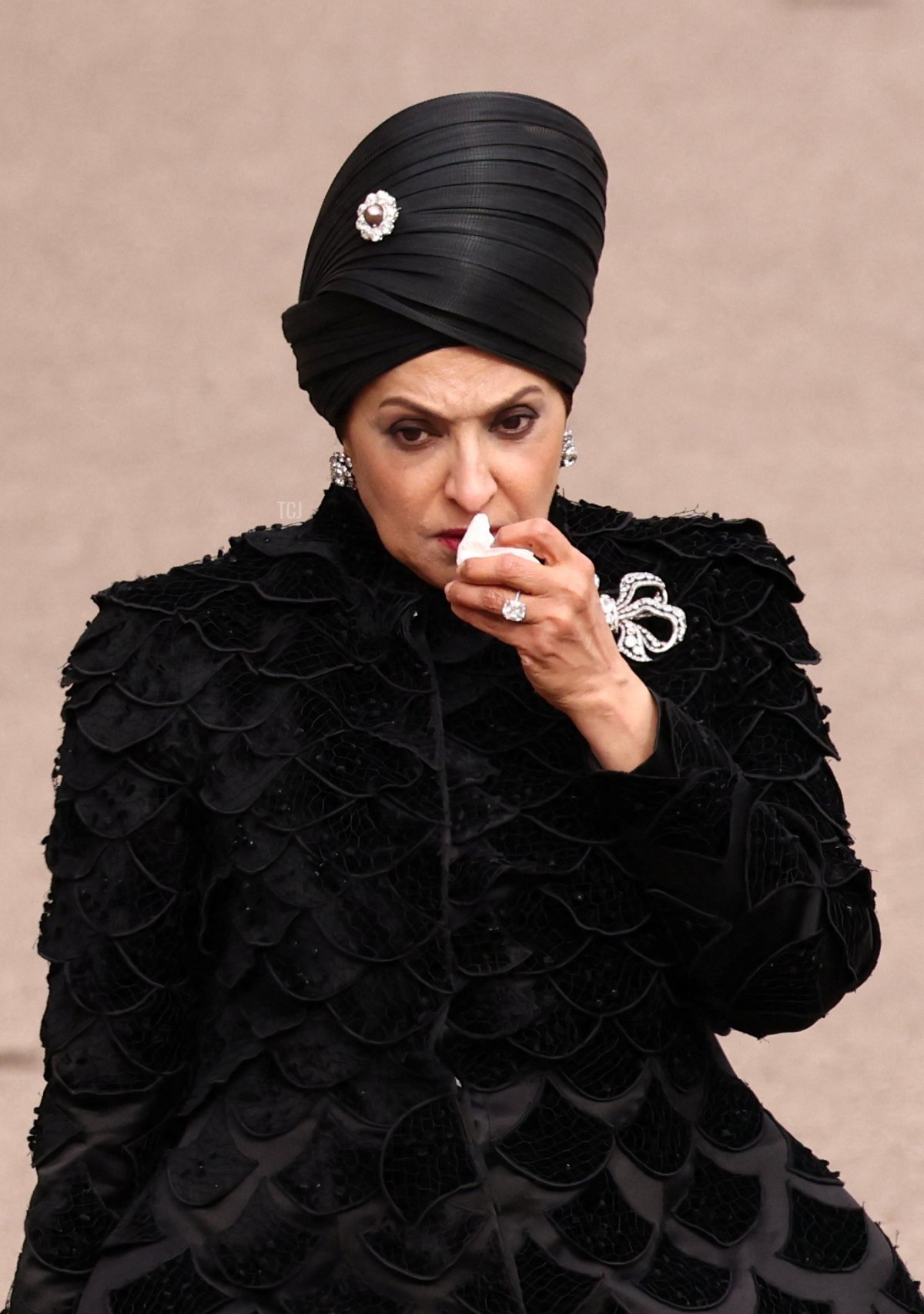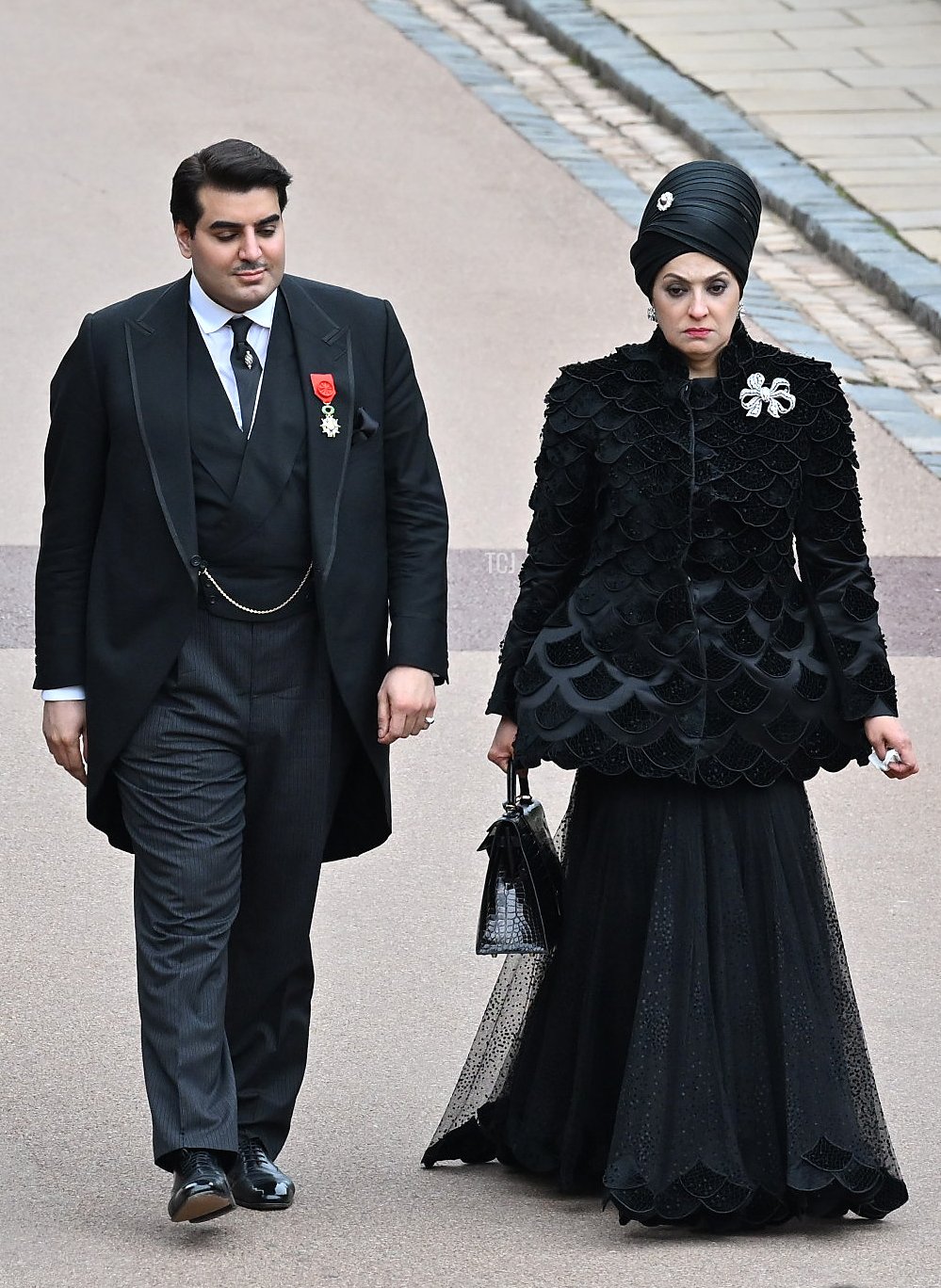 And speaking of auctions…! The Queen’s committal service at Windsor was attended by a range of royals, many of whom were there as government representatives or members of the Queen’s extended family. But there were also additional royals in attendance at St. George’s Chapel with other connections to the Queen. Princess Haya of Jordan (whose jewels we discussed here) and her uncle, Prince El Hassan, both have ties to the Queen through the equestrian world. And so do the two guests walking beside them: Sheikh Hamad Bin Abdullah Al Thani and his mother, Sheikha Amna bint Mohammed Al Thani.