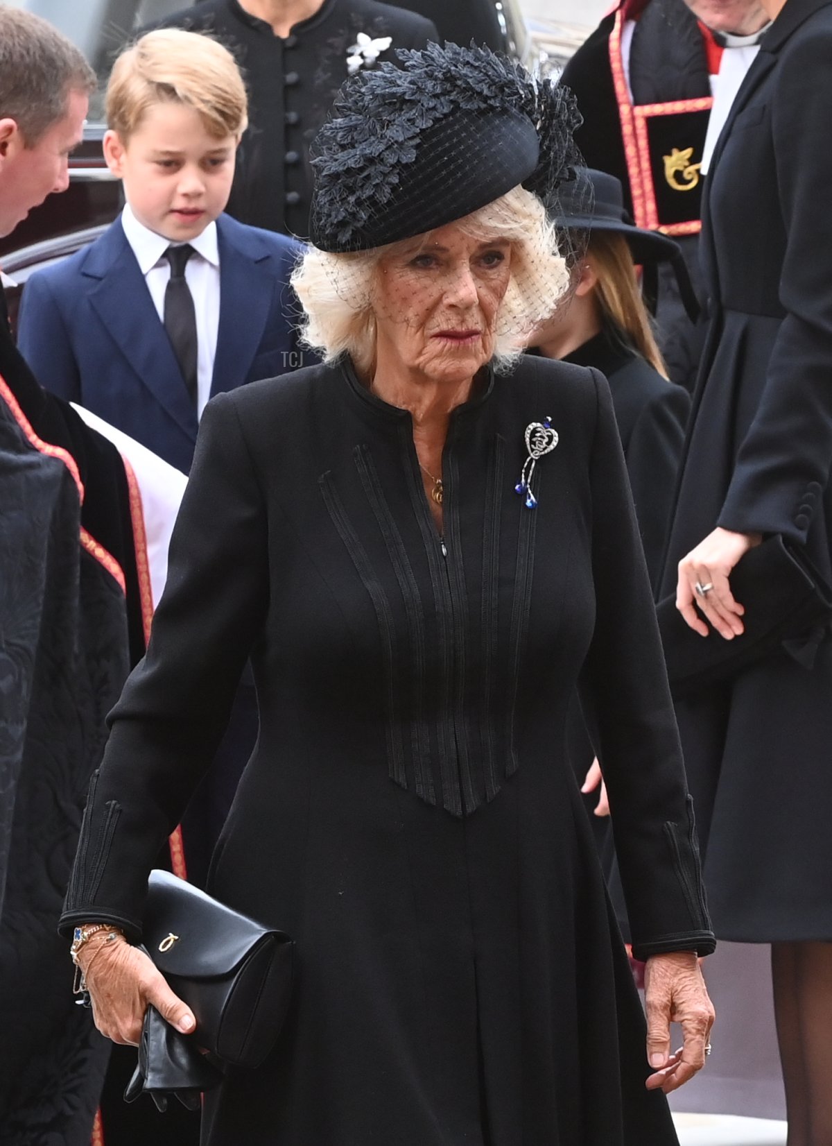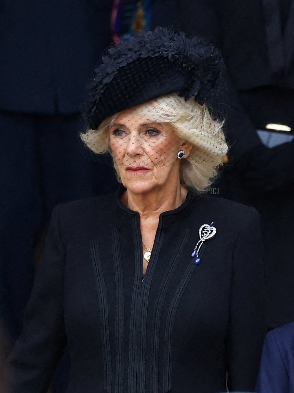 The Queen Consort wore a very important royal heirloom brooch for the service. This is the Hesse Diamond Jubilee Brooch, a gift presented to Queen Victoria in 1897. The diamond and sapphire jewel was a present from eight of Victoria’s grandchildren and their spouses: Tsar Nicholas II and Tsarina Alexandra of Russia, Grand Duke Ernest Louis and Grand Duchess Victoria Melita of Hesse, Grand Duke Sergei Alexandrovich and Grand Duchess Elizabeth Feodorovna of Russia, and Prince and Princess Louis of Battenberg (later Marquess and Marchioness of Milford Haven). All were members of the family of Victoria’s late daughter, Princess Alice. The main diamond portion of the brooch forms a heart shape, and inside the heart is the number 60 (the number of years in a Diamond Jubilee reign) in Cyrillic numerals.