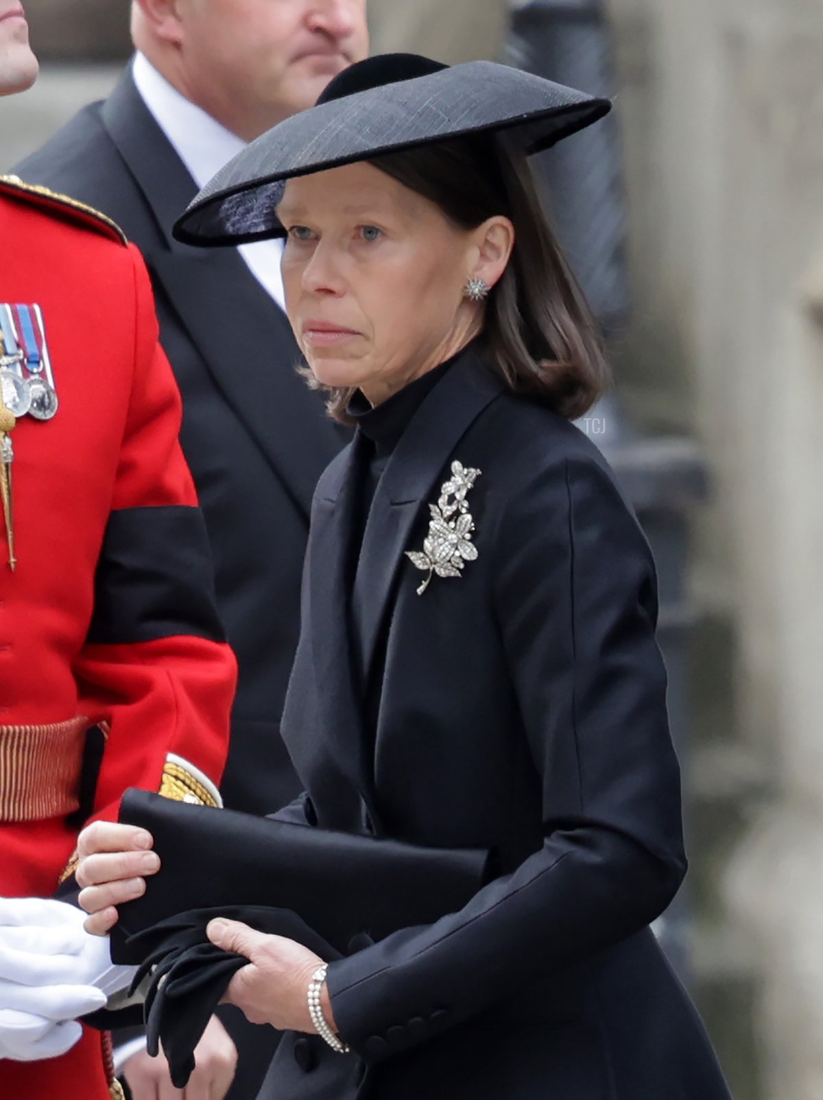 The always-elegant Lady Sarah Chatto, daughter of the late Princess Margaret, wore gorgeous jewels for the service. With her diamond starburst earrings and pearl bracelet, she wore one of the Snowdon Floral Brooches. The diamond brooch is part of a set that can also be worn on a tiara frame (as Sarah did on her wedding day).