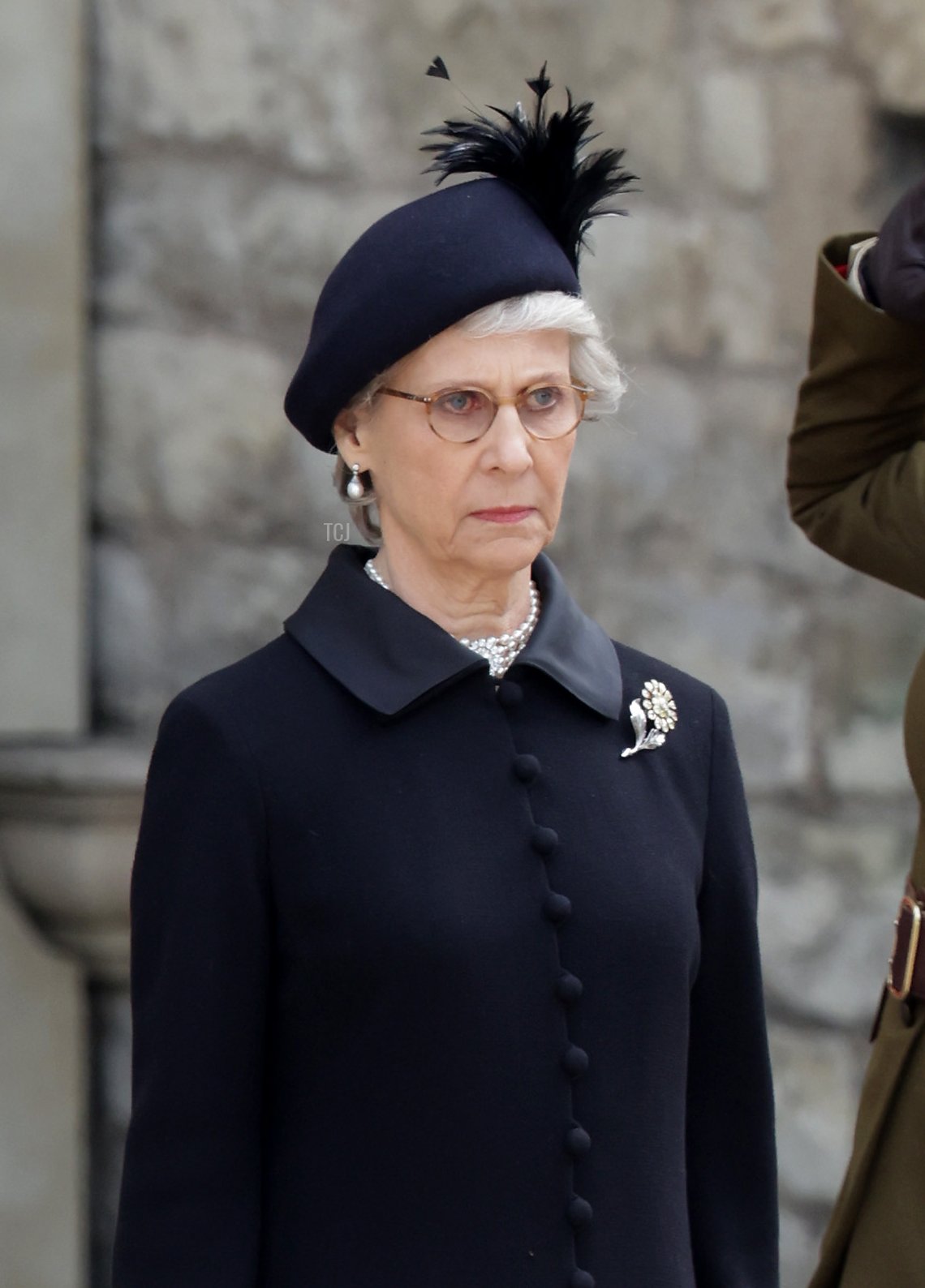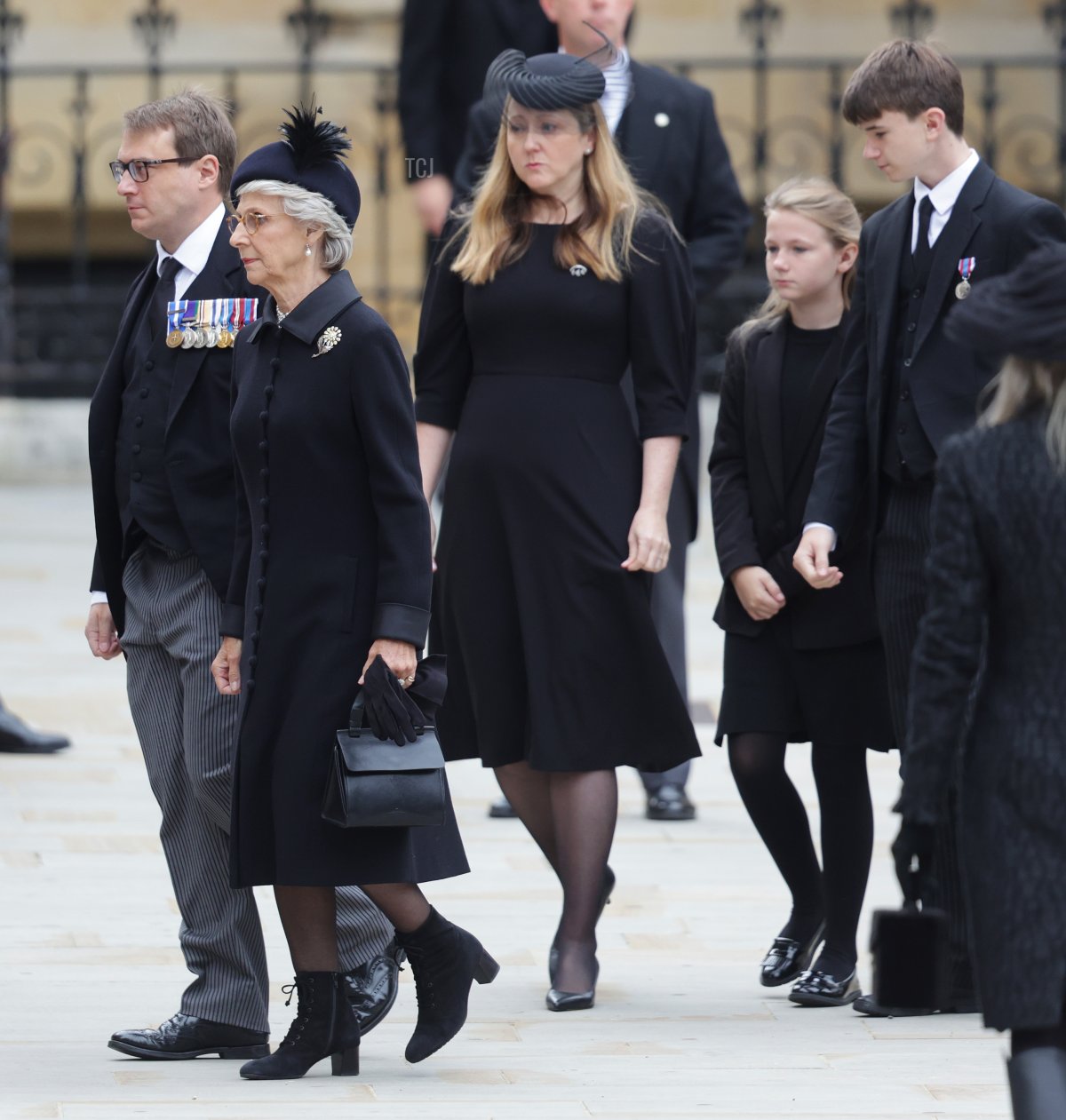 The extended royal family was also in attendance at the service, and I’ll share photographs of their jewels as they’re available. Here is the Duchess of Gloucester with her son and daughter-in-law, the Earl and Countess of Ulster, and their children, Lord Culloden and Lady Cosima Windsor.