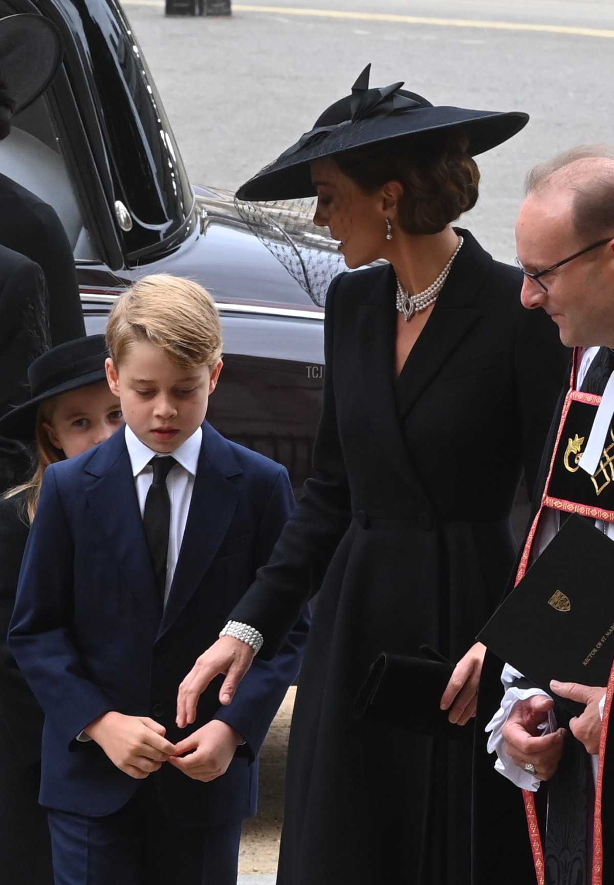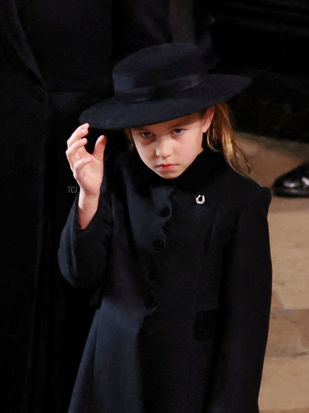 Prince George and Prince Charlotte of Wales joined their parents for today’s state funeral, and for the occasion, Princess Charlotte wore her first piece of significant jewelry in public. A small diamond horseshoe brooch was pinned to her jacket. People has confirmed that the brooch was given to Charlotte by the late Queen, her great-grandmother.