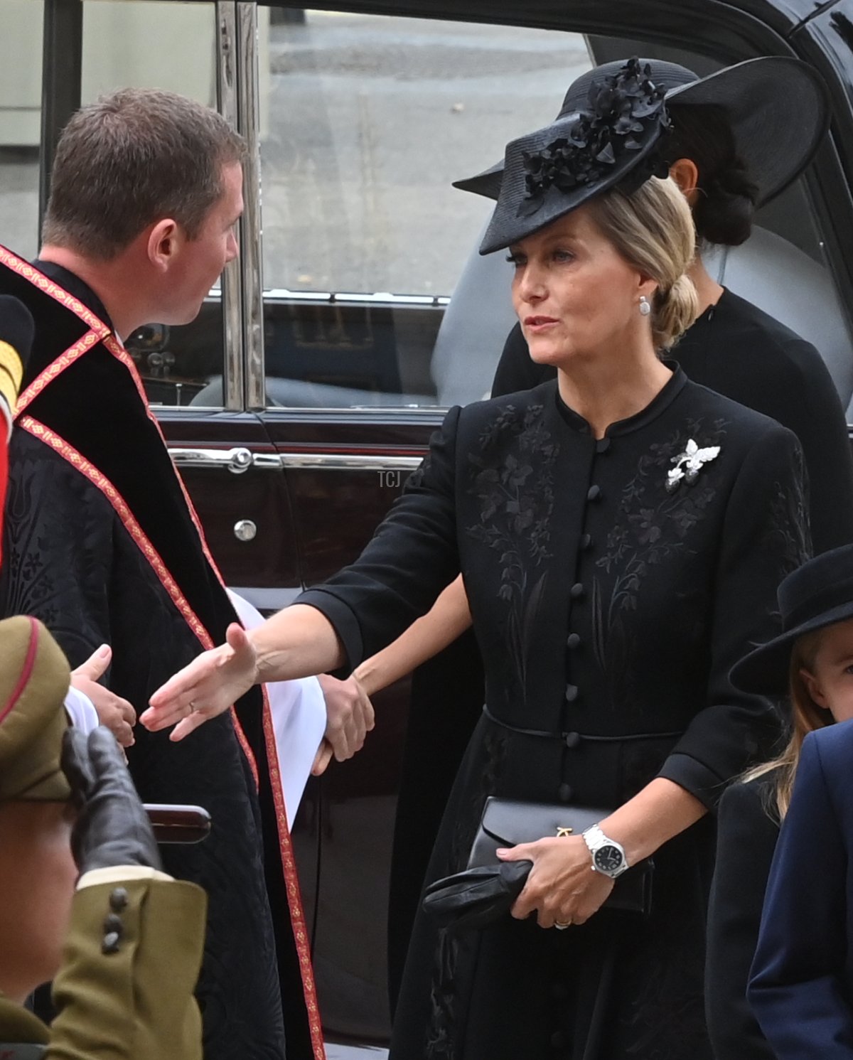 The Countess of Wessex wore pavé-set diamond earrings with her diamond berry brooch for the funeral. The brooch coordinated beautifully with the subtle floral embroidery on her dress.