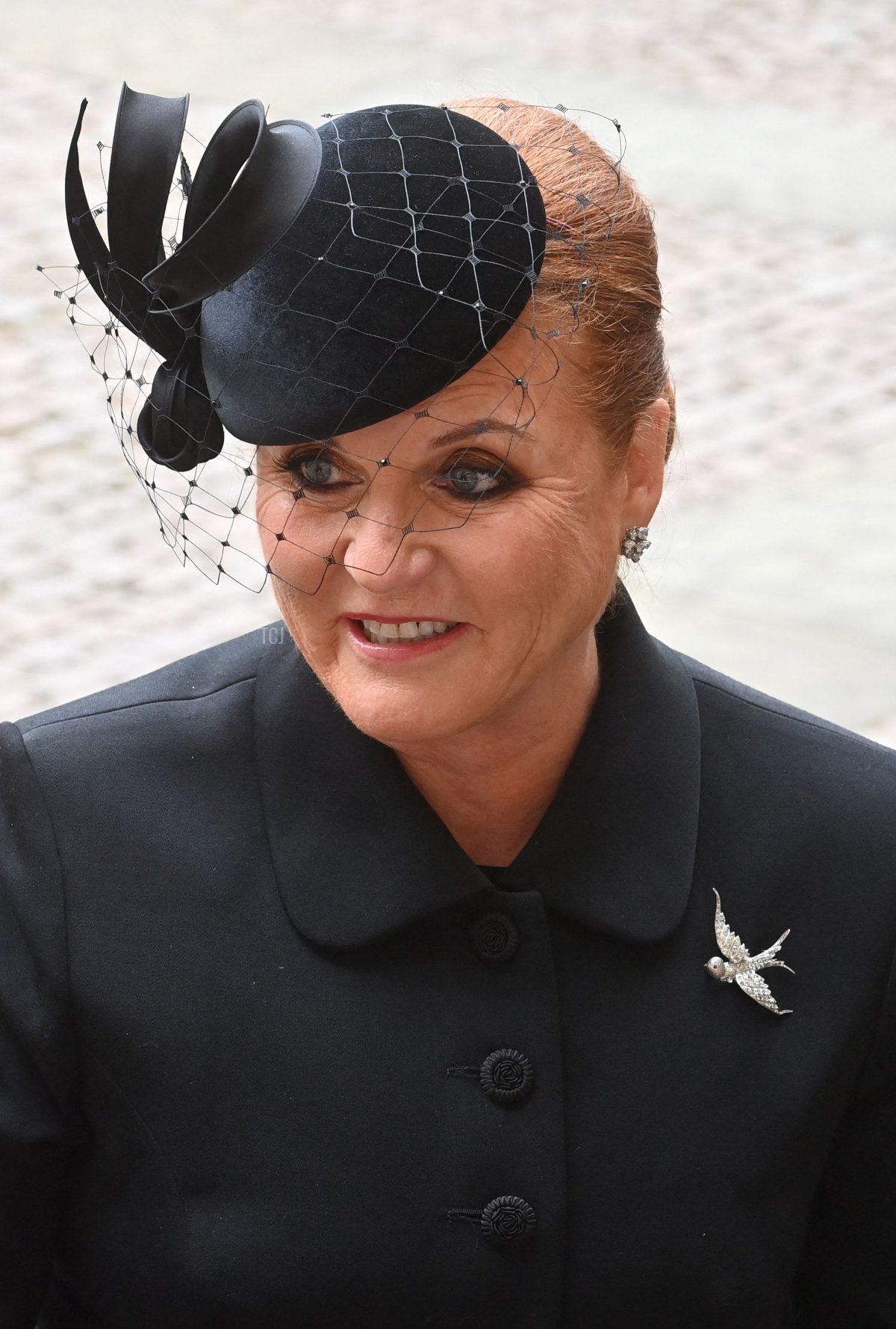 The mother of the two princesses, Sarah, Duchess of York, was at the service with the rest of the royal family. She wore diamond floral earrings with a diamond brooch in the shape of a dove.
