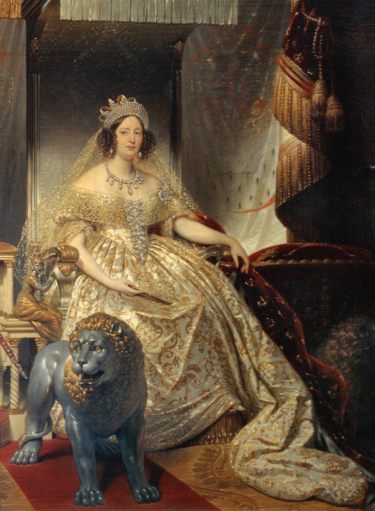 In 1839, King Christian VIII, a great-grandson of Christian VI and Sophie Magdalene, came to the throne of Denmark. His queen consort was his second wife, Caroline Amalie of Schleswig-Holstein-Sonderburg-Augustenburg. She’s pictured above in a detail of their coronation portrait. Check out those diamonds—including that interesting kokoshnik-shaped fringe tiara! Some of the diamond jewels, including the necklace and the floral brooch pinned near her shoulder, are still part of the Danish crown jewel collection today.