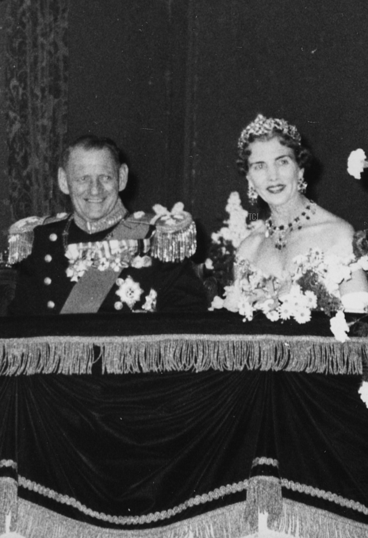 In a recent documentary, Queen Margrethe II of Denmark credited her mother, Queen Ingrid, with reviving the use of the nineteenth-century emerald parure. While the previous queens consort (Louise, Lovisa, and Alexandrine) had not made significant use of the suite, Queen Ingrid very much believed that the jewels should be worn. Like the other crown jewels, there are stipulations involved with the use of the emeralds: they should be worn only by the reigning queen or queen consort, they should not be taken out of the country, and they should only be worn for the grandest of gala occasions. Above, Queen Ingrid obeys all three rules, wearing the emeralds in May 1957 for a theater gala in Copenhagen during a state visit from Queen Elizabeth II of the United Kingdom.