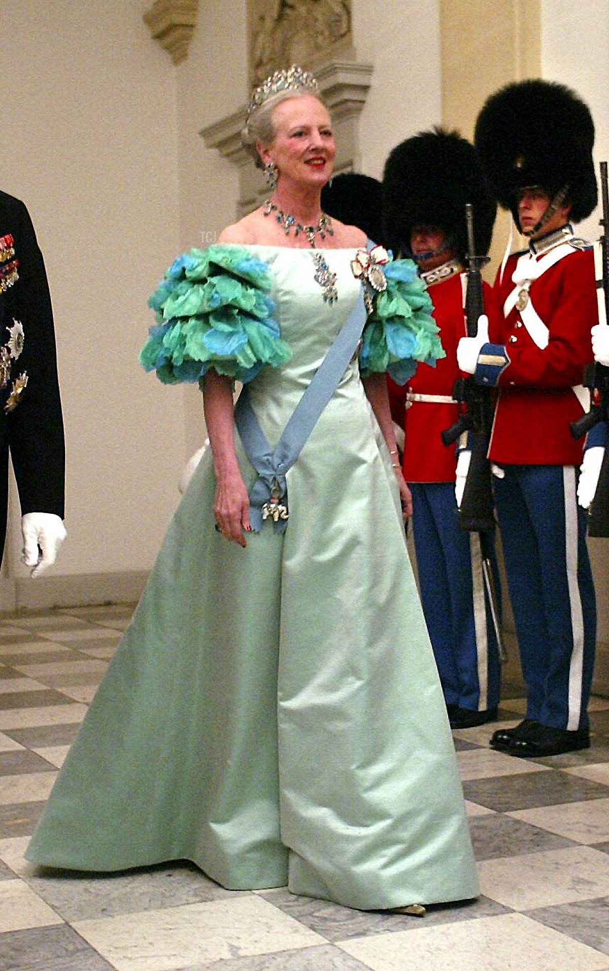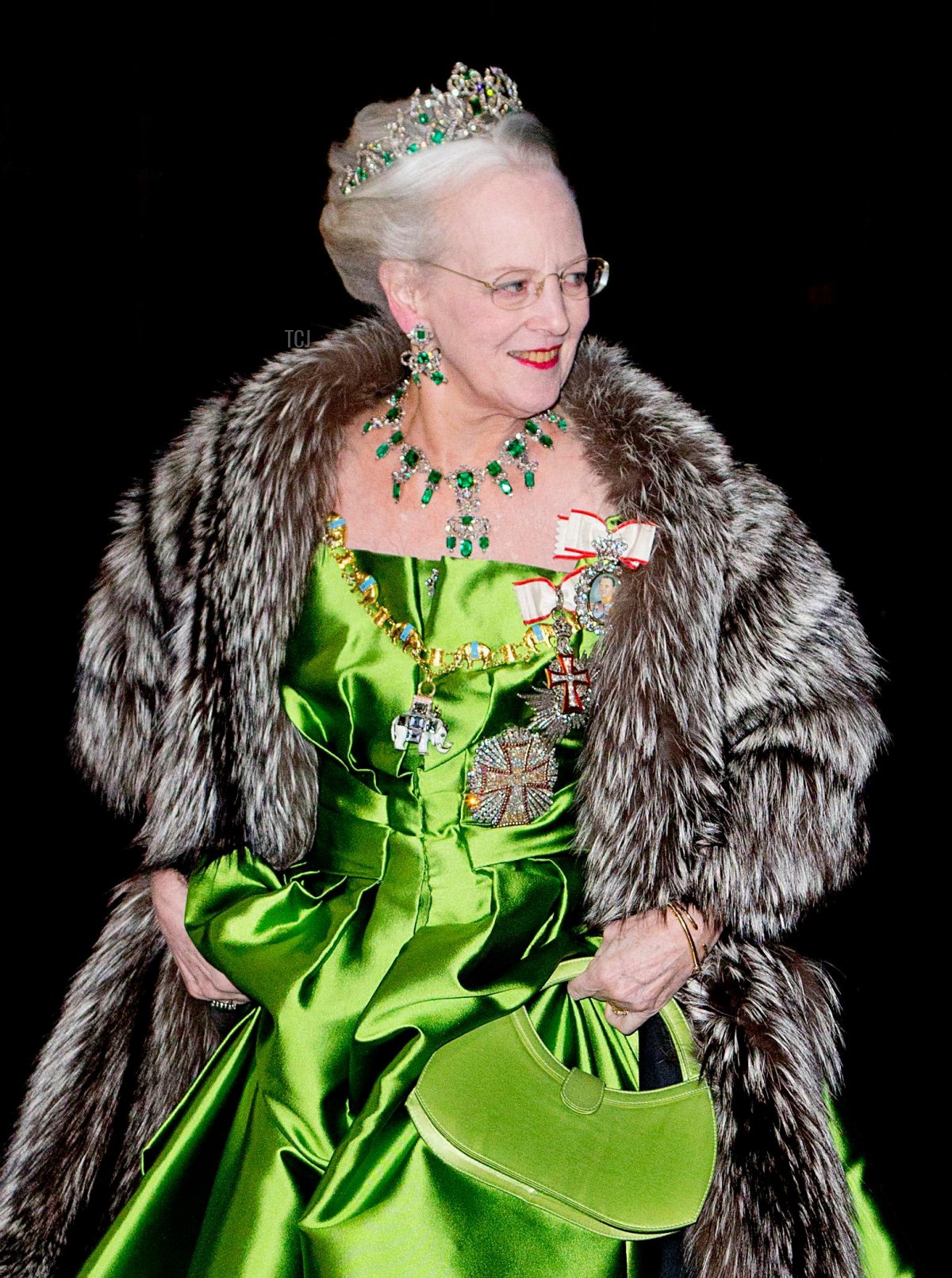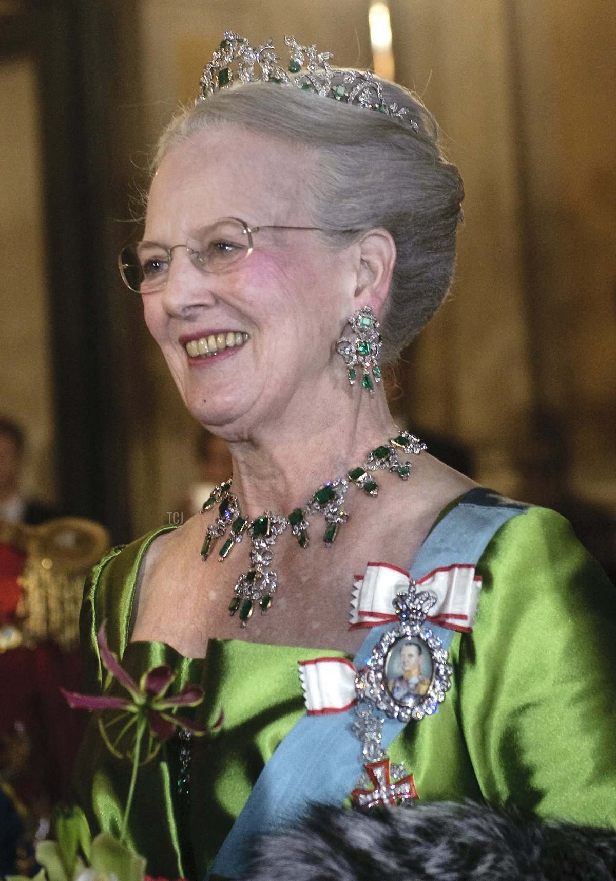 And here, Queen Margrethe wears the same gown with the emerald parure for the New Year’s Levee in Copenhagen on January 1, 2014.