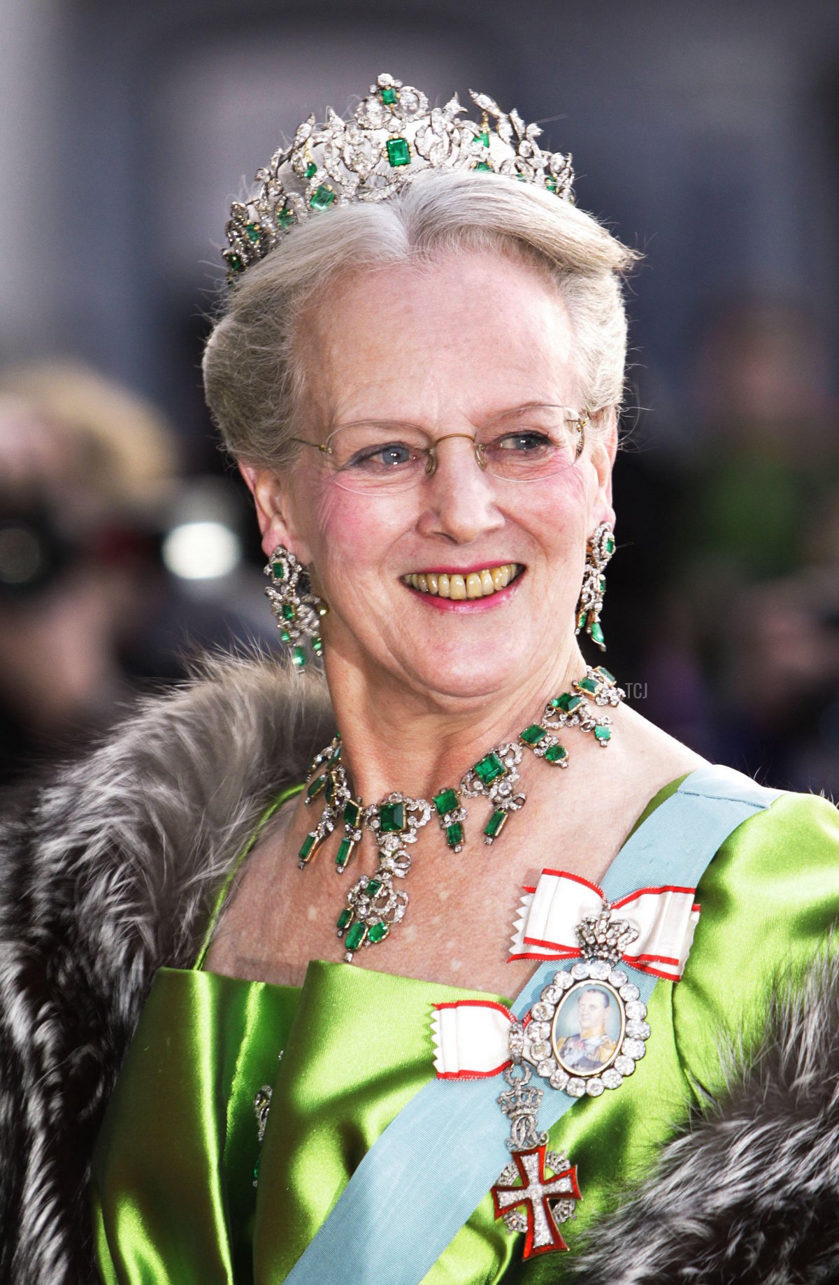 When Queen Margrethe ascended to the throne in 1972, she became the wearer of the emerald tiara and parure. She has also reserved the emerald jewels for some of the grandest gala occasions of her reign. Here, in May 2004, she wears the emeralds (with a very festive evening gown!) for a gala dinner in Copenhagen during the wedding celebrations for Crown Prince Frederik and Crown Princess Mary.