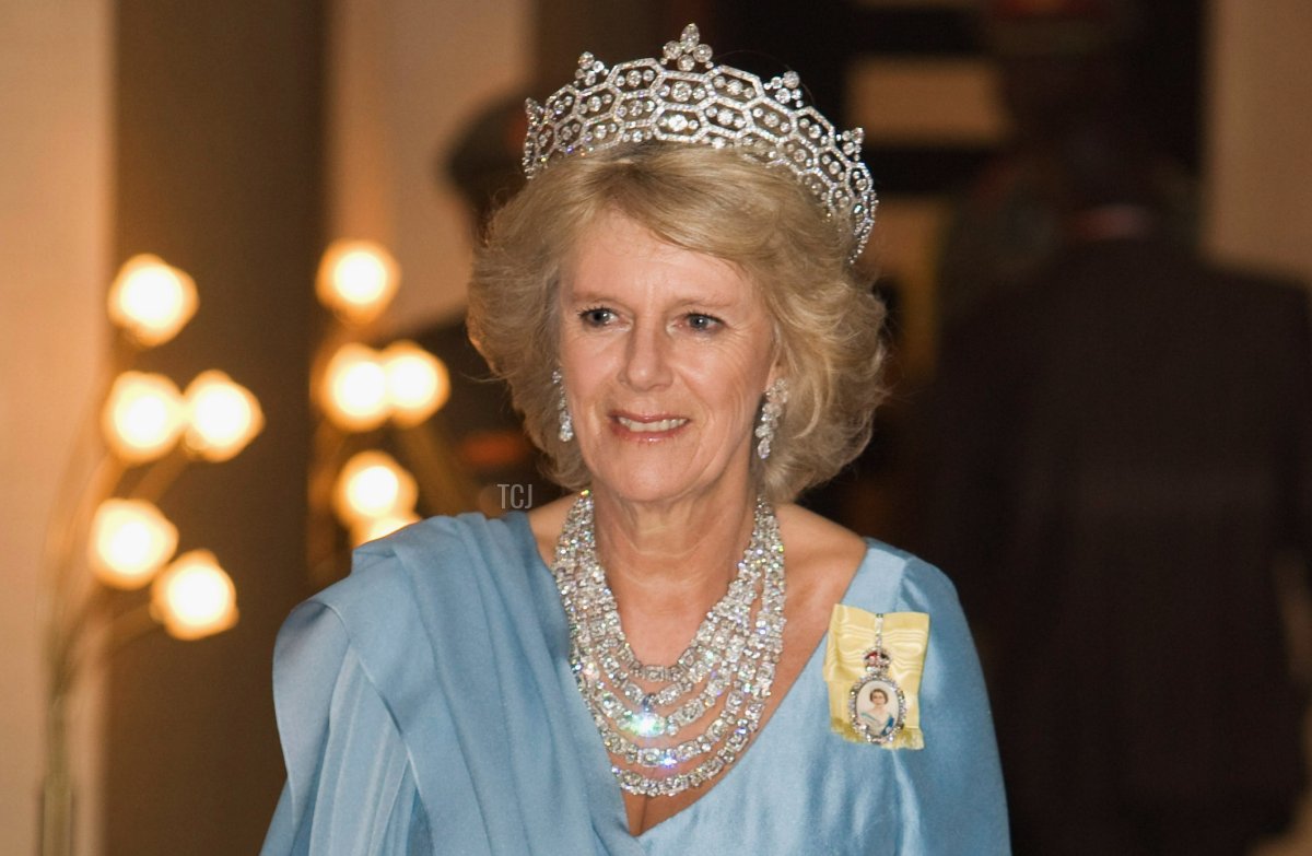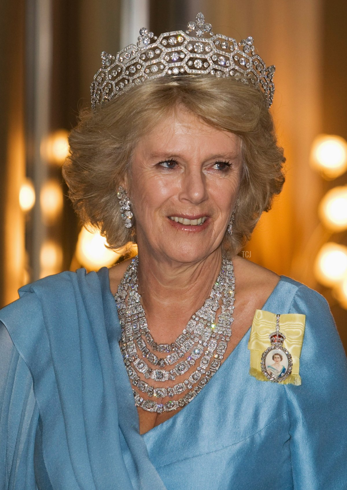 When the Queen Mother died in 2002, the necklace was inherited by the present Queen. She has offered it as a long-term loan to the Duchess of Cornwall, who has worn the complete piece on several occasions. The first was a Commonwealth Heads of Government Meeting Banquet in Uganda in November 2007. She wore the five-row necklace with the Greville Tiara and her own pear-shaped diamond cluster earrings.